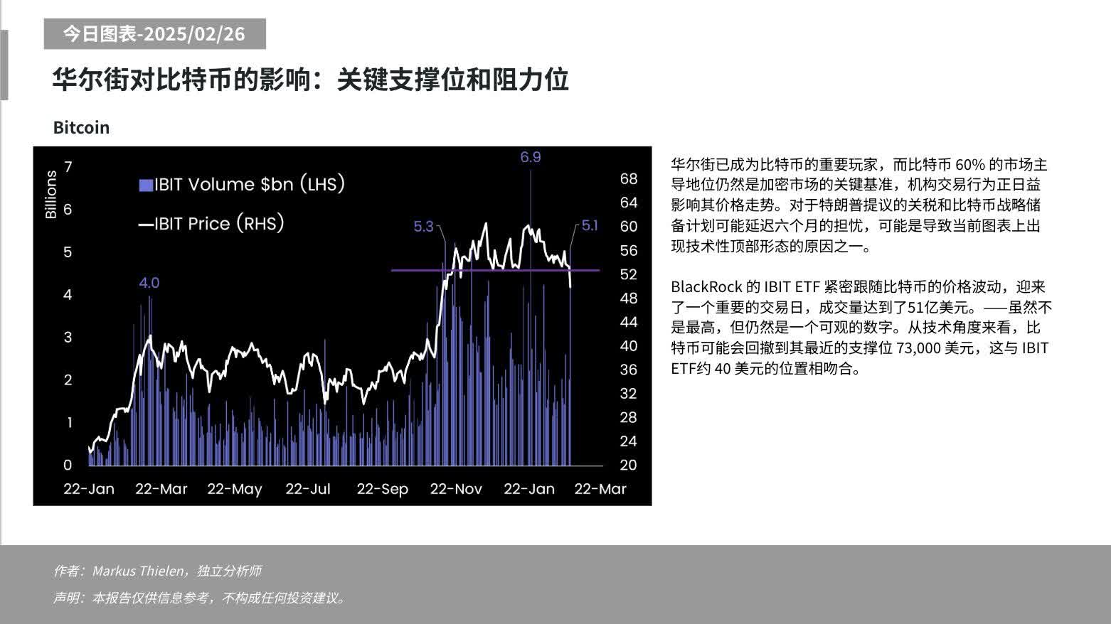 香港文匯報訊(記者 黎梓田)加密金融服務平台公司Matrixport發布圖表,點出華爾街已成為比特幣的重要玩家,而比特幣60%的市場主導地位仍然是加密市場的關鍵基準,機構交易行為正日益影響其價格走勢。對於特朗普提議的關稅和比特幣戰略儲備計劃可能延遲六個月的擔憂,可能是導致當前圖表上出現技術性頂部形態的原因之一。BlackRock的IBIT ETF近日迎來重要交易日,單日成交額達51億美元,雖非歷史最高但仍為可觀數字。從技術角度分析,比特幣可能回撤至最近支撐位73,000美元,對應IBIT ETF約40美元價位。