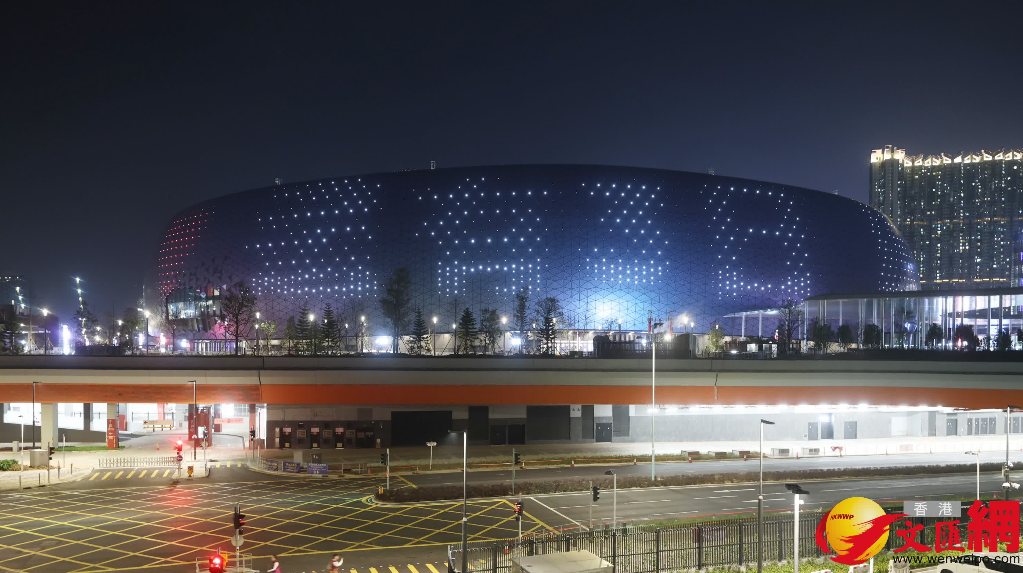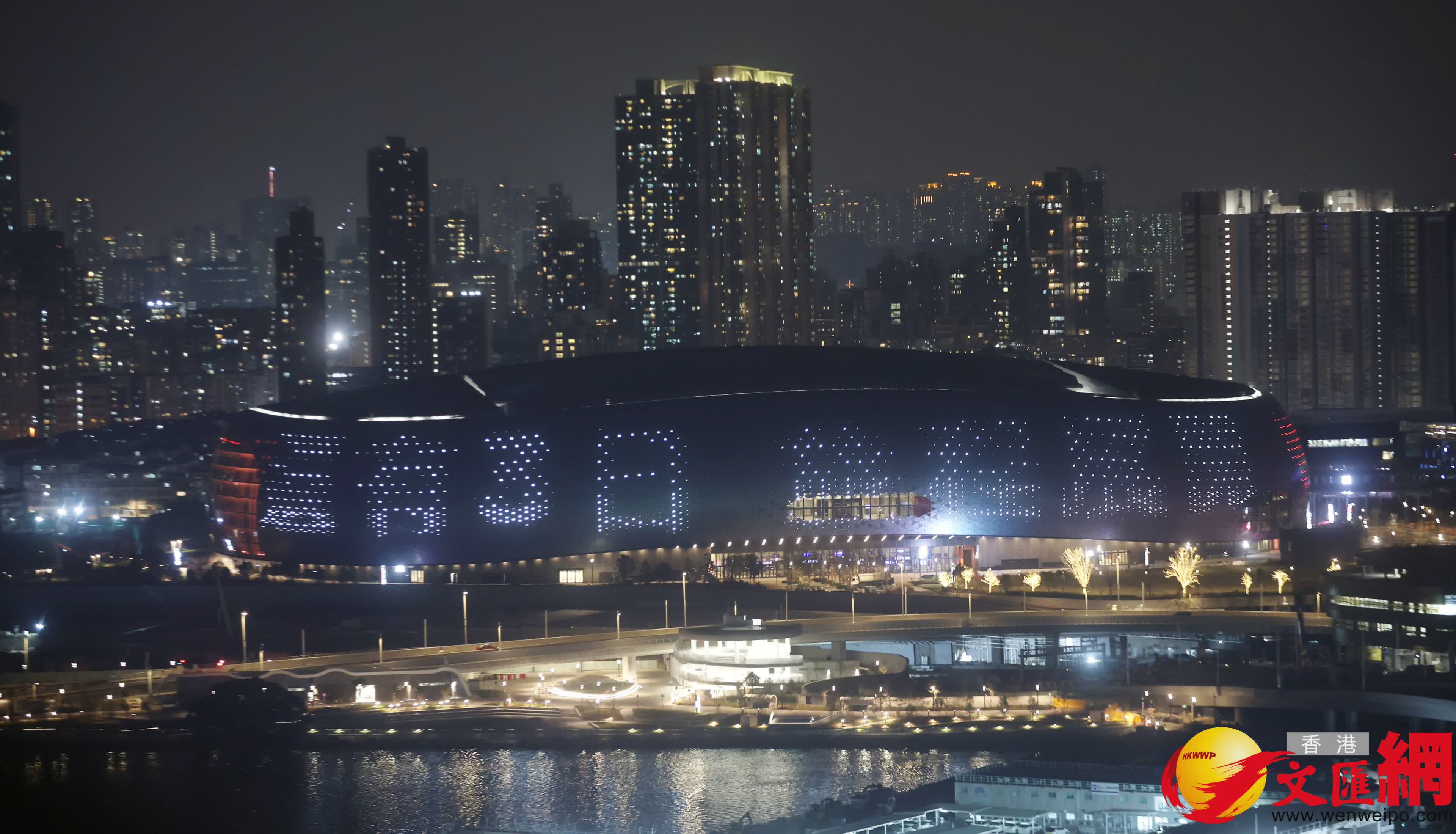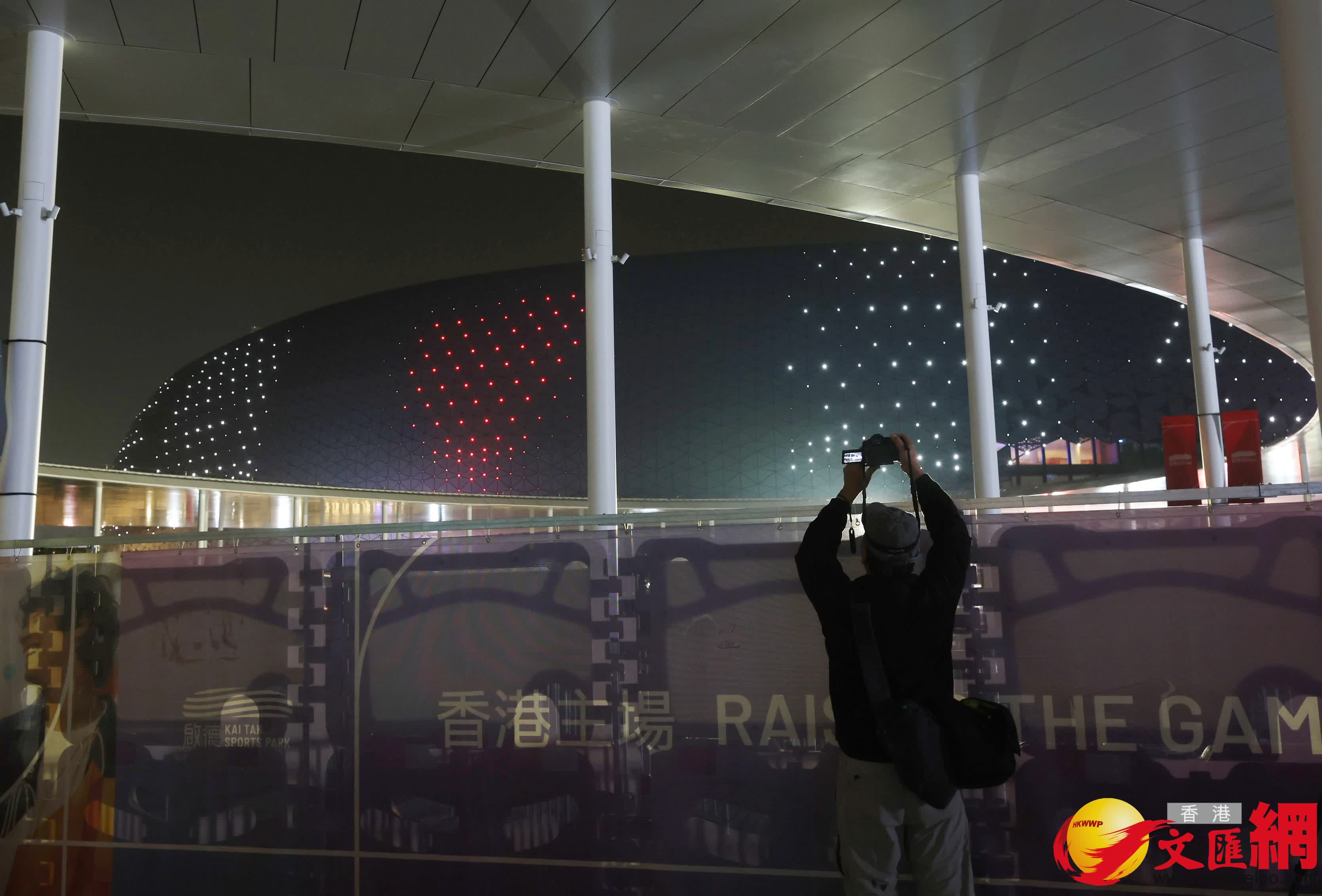 啟德體育園本周六開幕,今日起連續三晚於啟德主場館外牆上演LED燈光展。 (香港文匯報記者郭木又 攝)