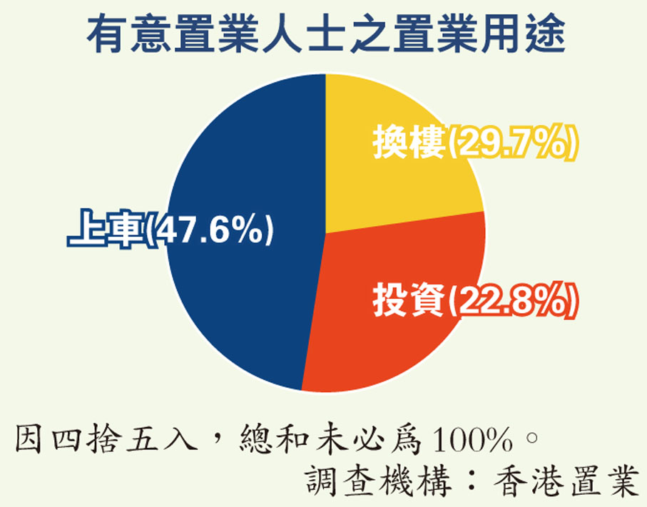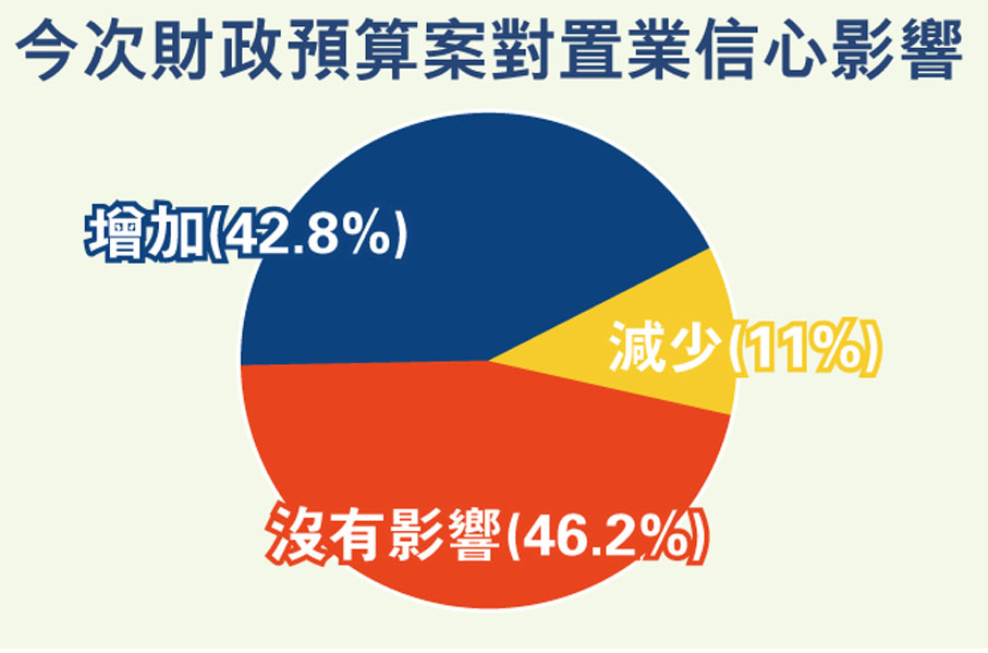 港置成功收回有效問卷共145份。結果顯示,有62.8%受訪者認為有受惠於預算案房策。另外,有46.2%認為置業信心沒有受影響,置業信心增加的受訪者佔近43%,而信心有所減少的則僅佔約11%,反映不少市民受惠預算案,對後市取態正面。同時,有47.6%受訪者置業用途為上車,其次有29.7%換樓,至於作投資用途的亦佔22.8%。