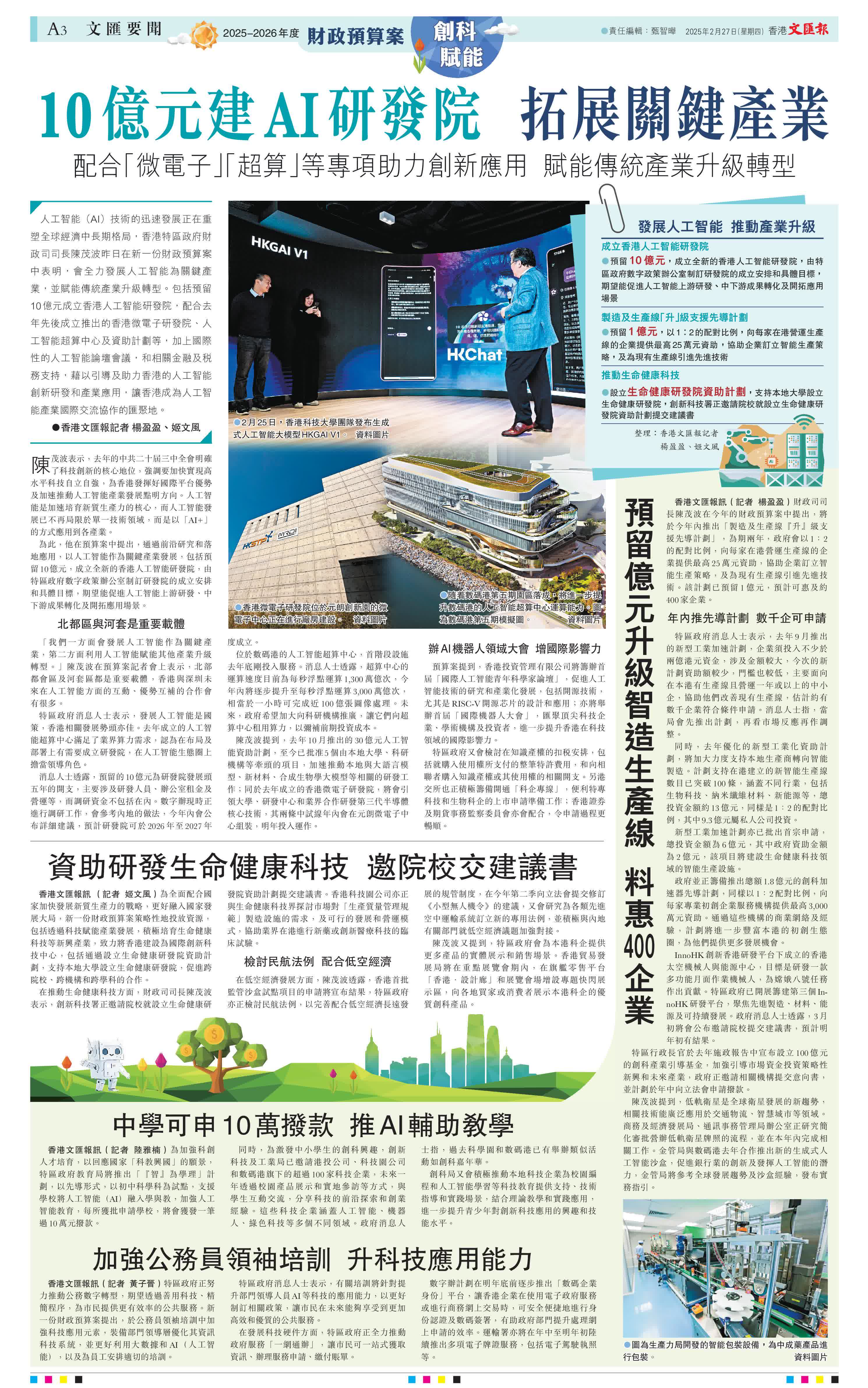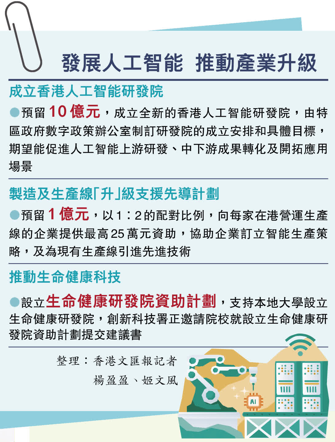 (香港文匯報記者 楊盈盈、姬文風)人工智能(AI)技術的迅速發展正在重塑全球經濟中長期格局,香港特區政府財政司司長陳茂波昨日在新一份財政預算案中表明,會全力發展人工智能為關鍵產業,並賦能傳統產業升級轉型。包括預留10億元成立香港人工智能研發院,配合去年先後成立推出的香港微電子研發院、人工智能超算中心及資助計劃等,加上國際性的人工智能論壇會議,和相關金融及稅務支持,藉以引導及助力香港的人工智能創新研發和產業應用,讓香港成為人工智能產業國際交流協作的匯聚地。