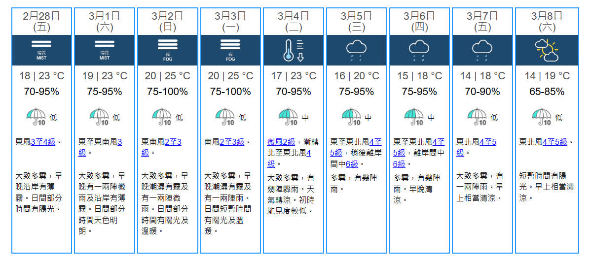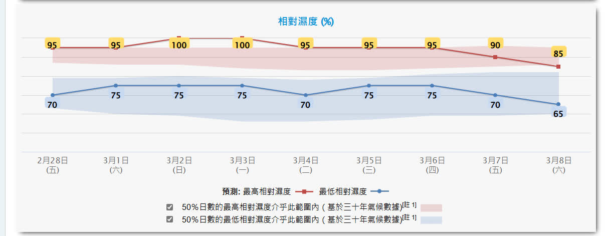 據香港天文台今日(27日)發布的九日天氣預報,未來一連7日濕度可高達95%,周日及下周一(3月2日及3日)更預計達到100%!市民記得準備好除濕機、除濕盒、乾燥劑等,應對即將到來的回南天天氣。