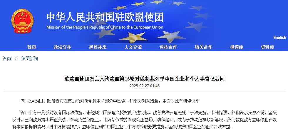 中國駐歐盟使團26日回應歐盟第16輪對俄制裁列單中國企業和個人事,表示已向歐方提出嚴正交涉,敦促歐方立即停止列單中國企業。