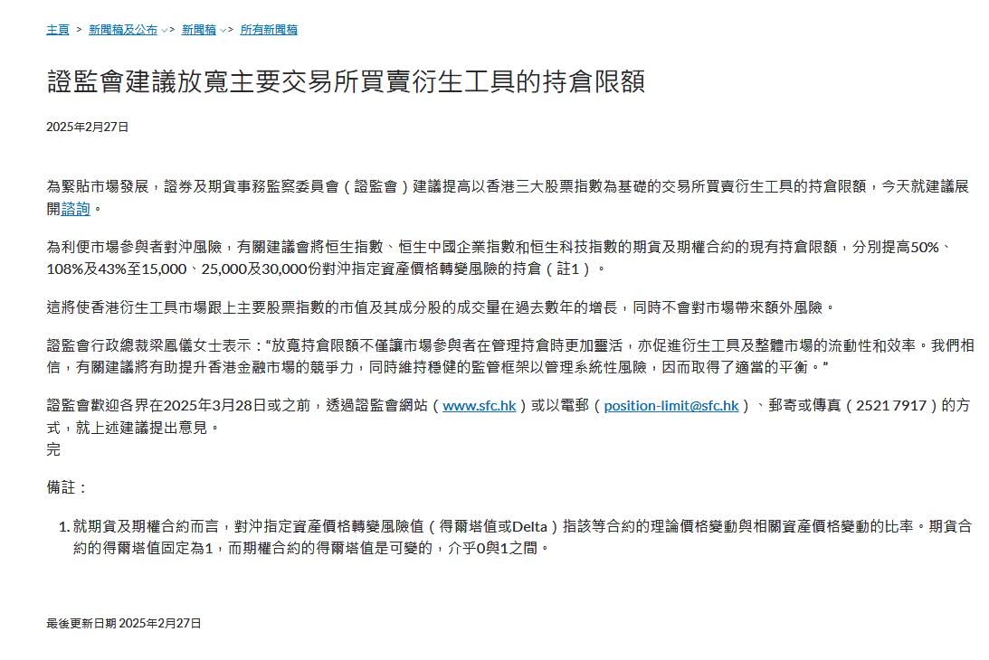 今日(27日),香港證監會發文,為緊貼市場發展,建議提高以香港三大股票指數為基礎的交易所買賣衍生工具的持倉限額,就建議展開諮詢。