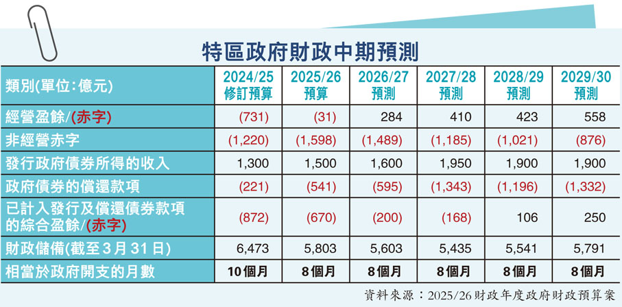 新預算案指出,在中期財政預測期內,預計政府債務與本地生產總值的比率將維持在12%至16.5%的水平,屬於非常穩健和可控的水平,遠低於大部分先進經濟體的債務水平。政府並預計未來5年的經營賬目和非經營賬目的赤字均會按年收窄,其中經營賬目在2026/27年度起恢復盈餘;至於非經營賬目,赤字由2025/26年度的1,598億元逐步下降至2029/30年度的876億元。計入政府發債淨所得,政府綜合賬目在2028/29年度起將恢復盈餘。