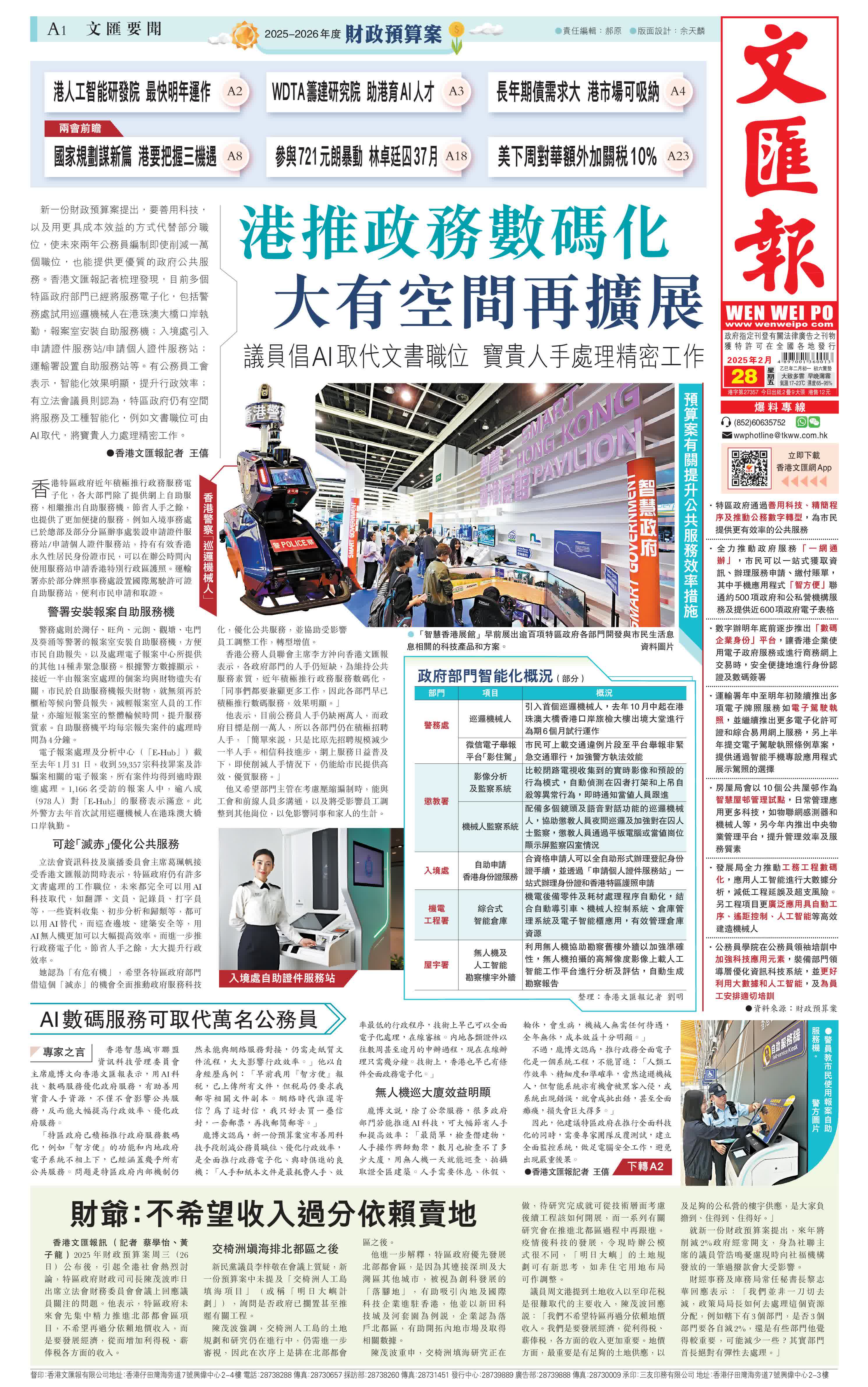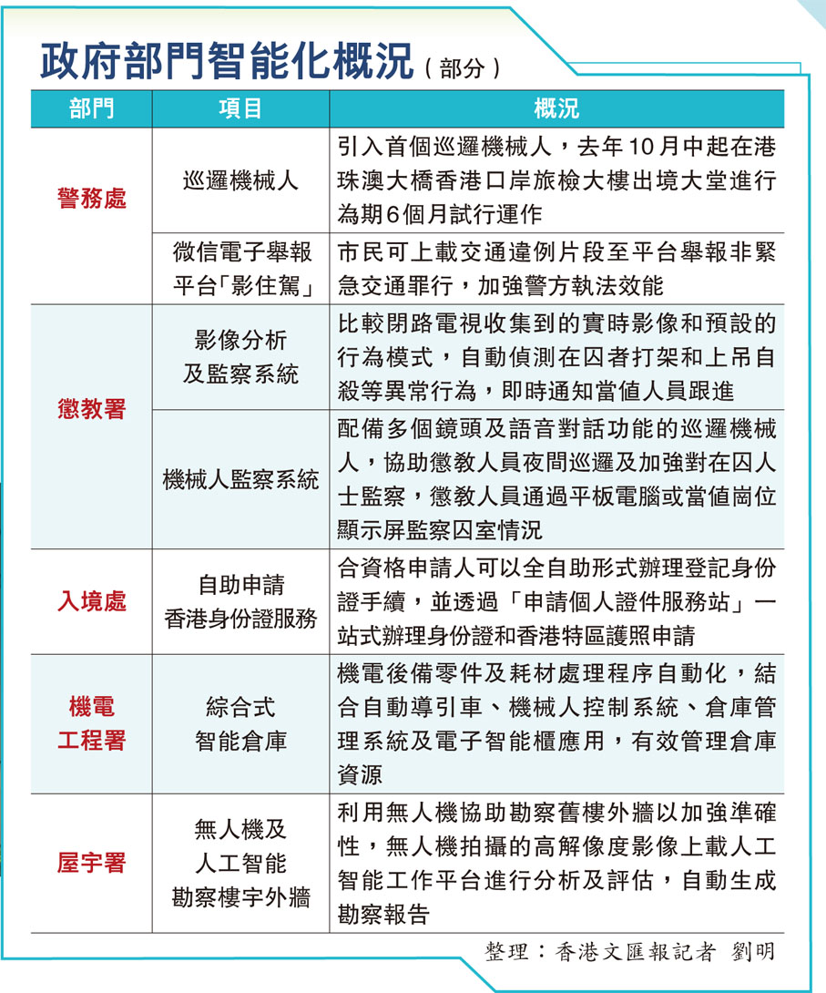 (香港文匯報記者 王僖)新一份財政預算案提出,要善用科技,以及用更具成本效益的方式代替部分職位,使未來兩年公務員編制即使削減一萬個職位,也能提供更優質的政府公共服務。香港文匯報記者梳理發現,目前多個特區政府部門已經將服務電子化,包括警務處試用巡邏機械人在港珠澳大橋口岸執勤,報案室安裝自助服務機;入境處引入申請證件服務站/申請個人證件服務站;運輸署設置自助服務站等。有公務員工會表示,智能化效果明顯,提升行政效率;有立法會議員則認為,特區政府仍有空間將服務及工種智能化,例如文書職位可由AI取代,將寶貴人力處理精密工作。
