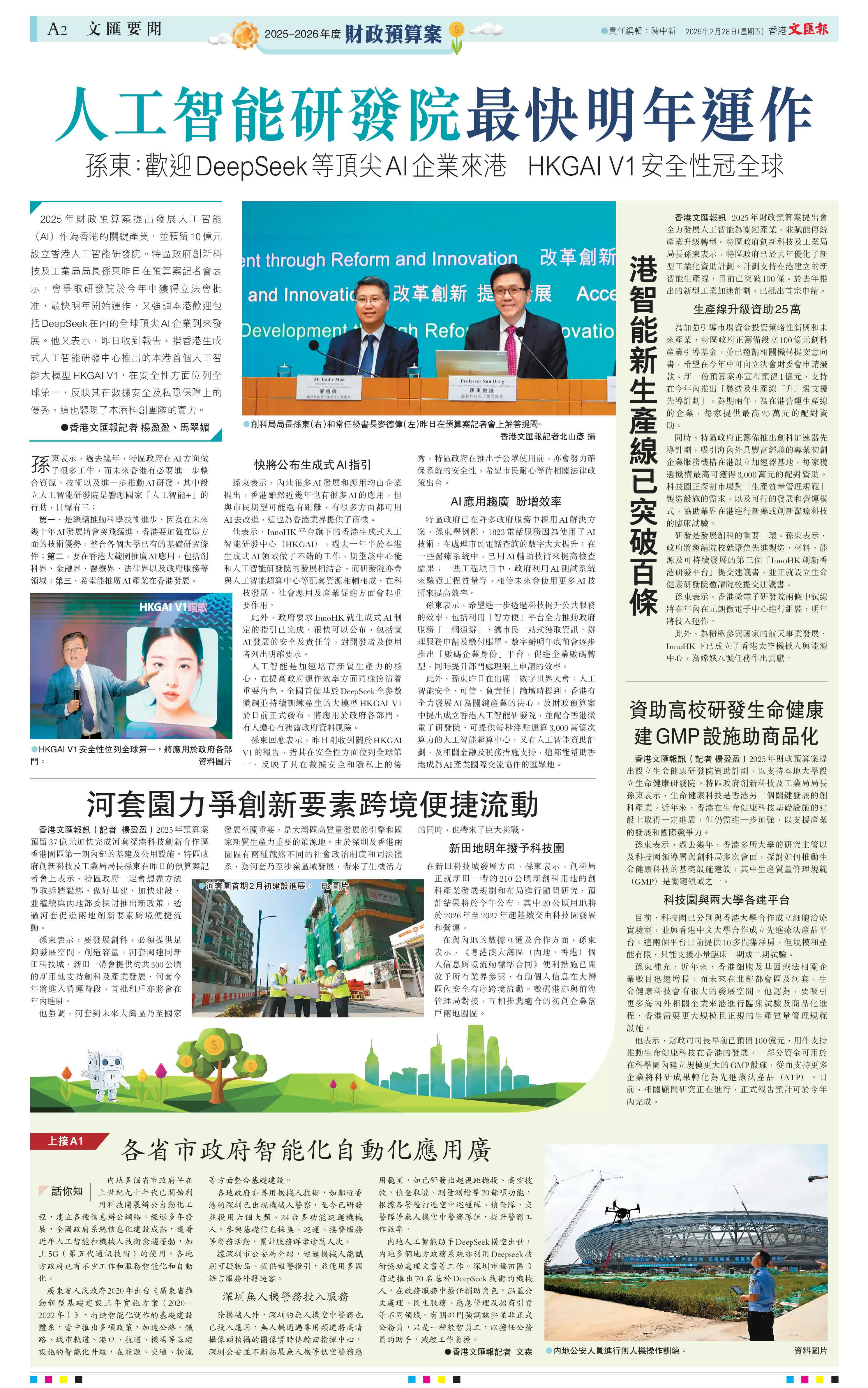 ‧發展局全力推動工務工程數碼化,應用人工智能進行大數據分析,減低工程延誤及超支風險。另工程項目更廣泛應用具自動工序、遙距控制、人工智能等高效建造機械人