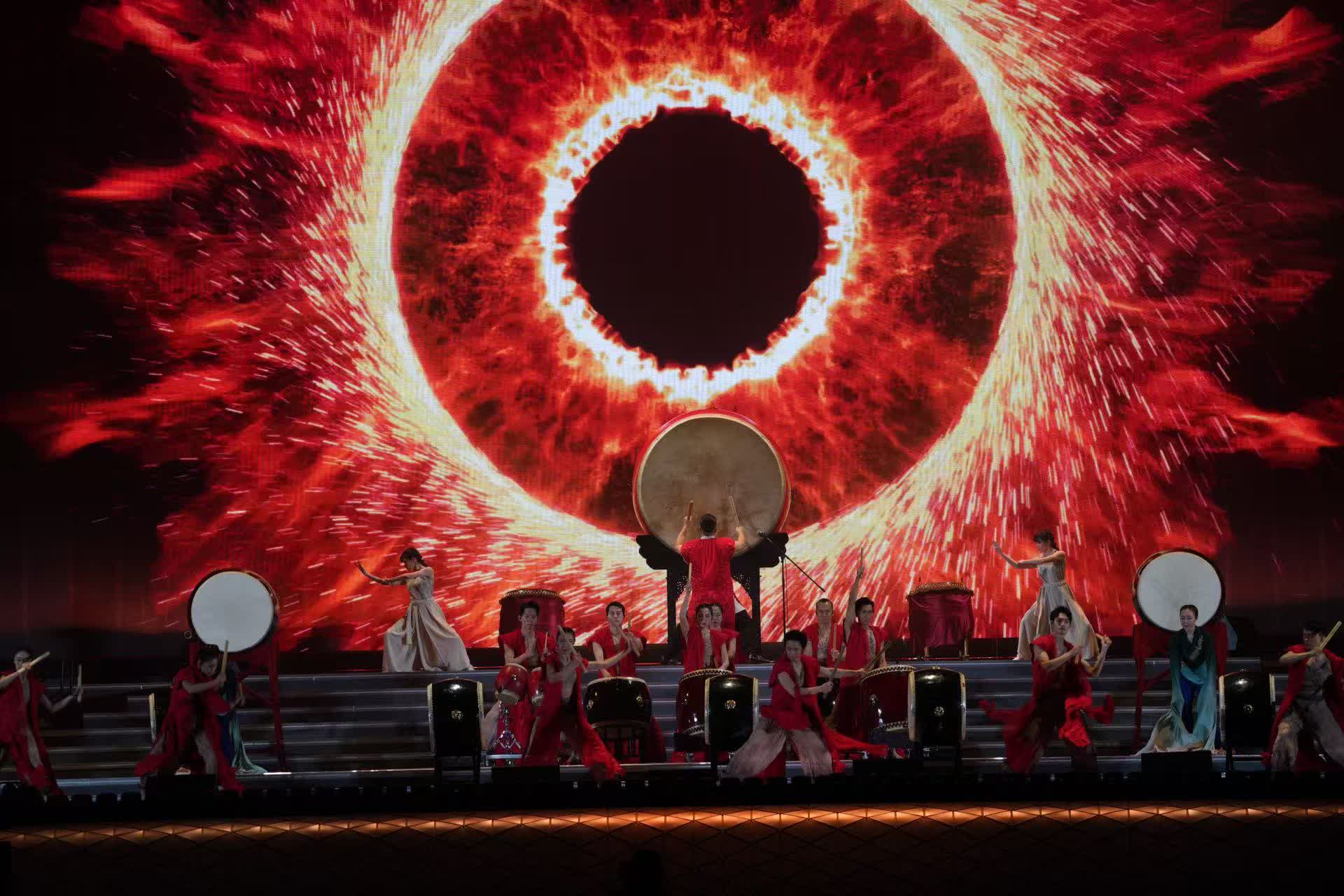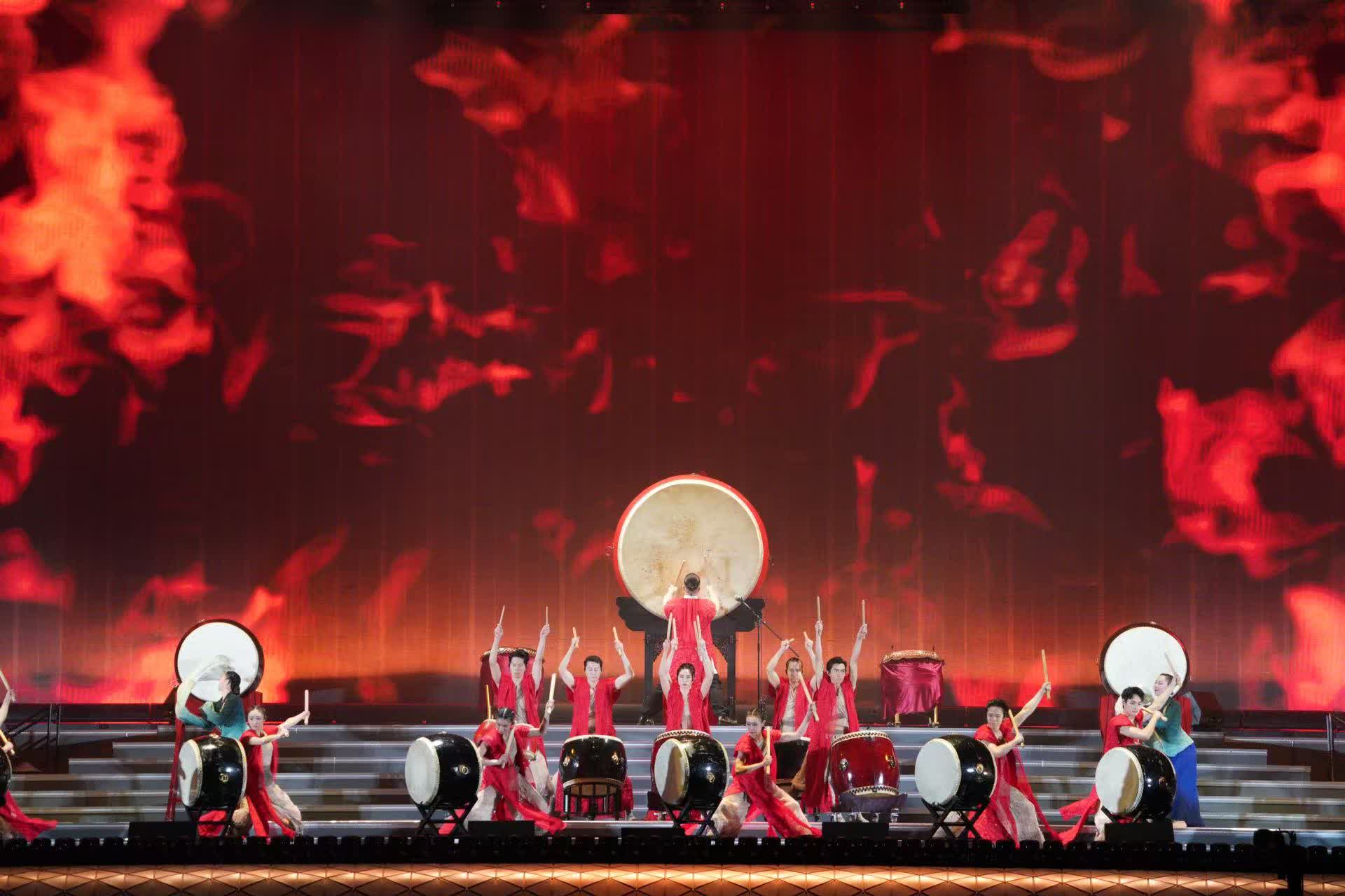 首個節目《鼓舞飛揚》更是迅速炒熱現場氛圍,舞台中央有一個巨大的圓鼓,鼓面朝向觀眾,鼓身裝飾華麗,整個場景被溫暖的燈光照亮,營造出熱烈莊重的氛圍。舞台下方的燈光設計也十分講究,一排排燈光如同繁星點點,為舞台增添了不少光彩。表演者身穿紅衣,鼓聲協調有度,雄壯有力,現場觀眾亦紛紛拿起手機拍照紀念,現場人聲鼎沸。