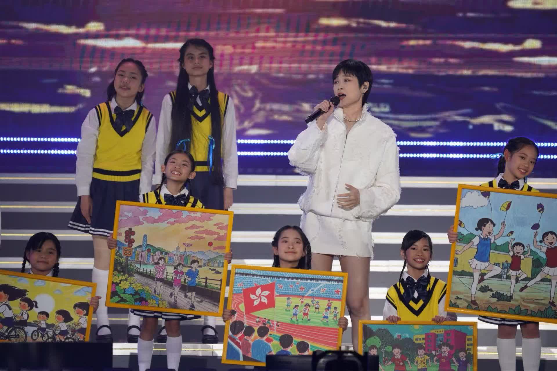 李宇春與小朋友演唱《和你一樣》,童聲如同天籟,歌曲治癒人心,溫暖純粹。小朋友們手持畫板,展示作為香港小朋友,自己成長路上的點點滴滴。