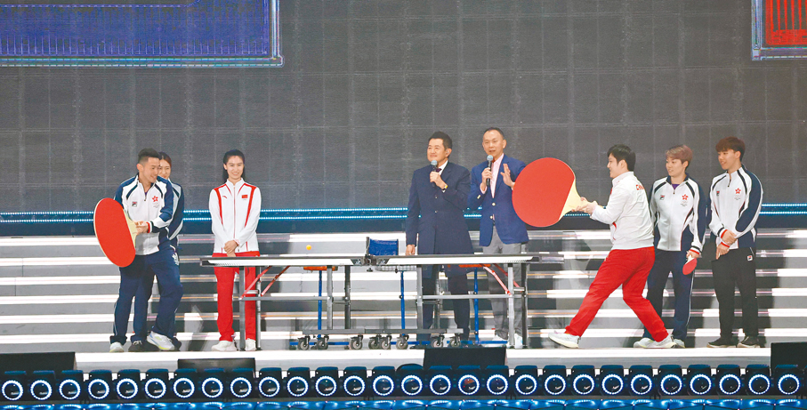 「大乒乓小乒乓球友誼賽」環節將現場氣氛推到高峰。國家隊乒乓球代表樊振東出場時獲得全場歡呼,他與港隊代表杜凱琹及陳顥樺組成紅隊,對陣由黃鎮廷、朱成竹、郭崎琪組成的藍隊,以巨型球拍進行「紅藍趣味乒乓友誼賽」。選手們手持超大球拍展開歡樂對決,最終樊振東的紅隊以6比1戰勝藍隊。