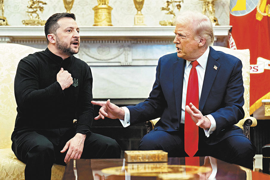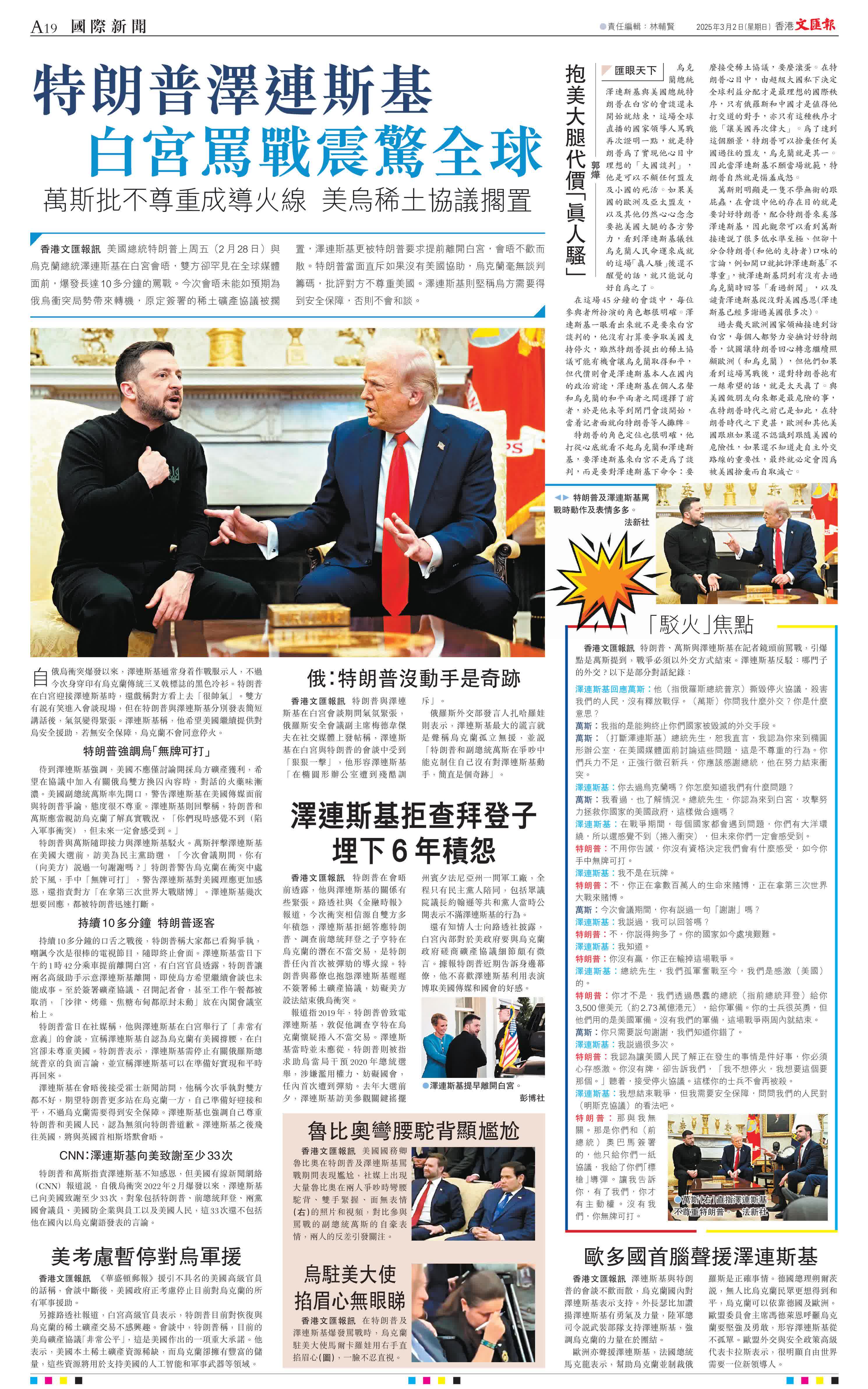 香港文匯報訊 美國總統特朗普上周五(2月28日)與烏克蘭總統澤連斯基在白宮會晤,雙方卻罕見在全球媒體面前,爆發長達10多分鐘的罵戰。今次會晤未能如預期為俄烏衝突局勢帶來轉機,原定簽署的稀土礦產協議被擱置,澤連斯基更被特朗普要求提前離開白宮,會晤不歡而散。特朗普當面直斥如果沒有美國協助,烏克蘭毫無談判籌碼,批評對方不尊重美國。澤連斯基則堅稱烏方需要得到安全保障,否則不會和談。