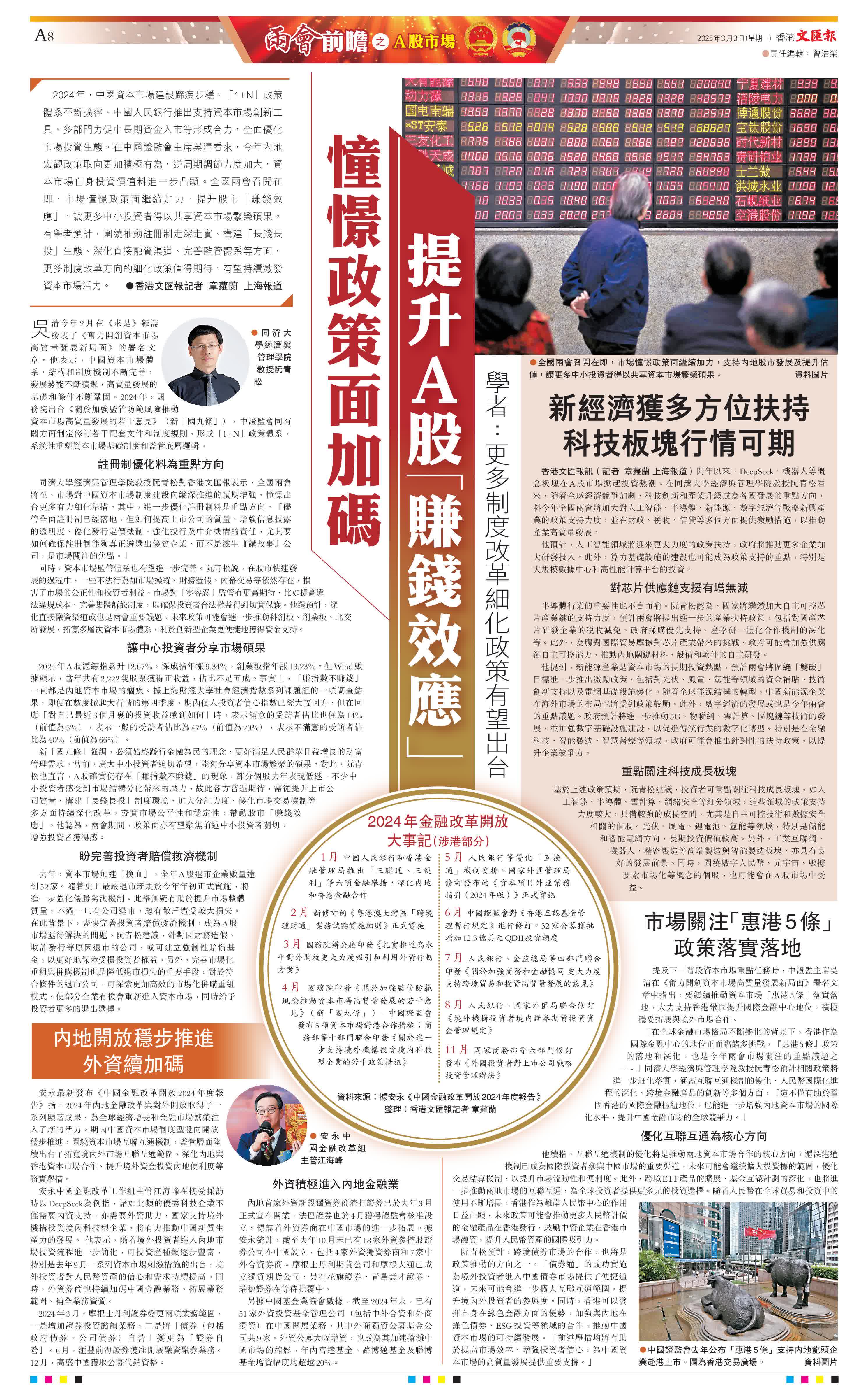 (香港文匯報記者 章蘿蘭 上海報道)2024年,中國資本市場建設蹄疾步穩。「1+N」政策體系不斷擴容、中國人民銀行推出支持資本市場創新工具、多部門力促中長期資金入市等形成合力,全面優化市場投資生態。在中國證監會主席吳清看來,今年內地宏觀政策取向更加積極有為,逆周期調節力度加大,資本市場自身投資價值料進一步凸顯。全國兩會召開在即,市場憧憬政策面繼續加力,提升股市「賺錢效應」,讓更多中小投資者得以共享資本市場繁榮碩果。有學者預計,圍繞推動註冊制走深走實、構建「長錢長投」生態、深化直接融資渠道、完善監管體系等方面,更多制度改革方向的細化政策值得期待,有望持續激發資本市場活力。
