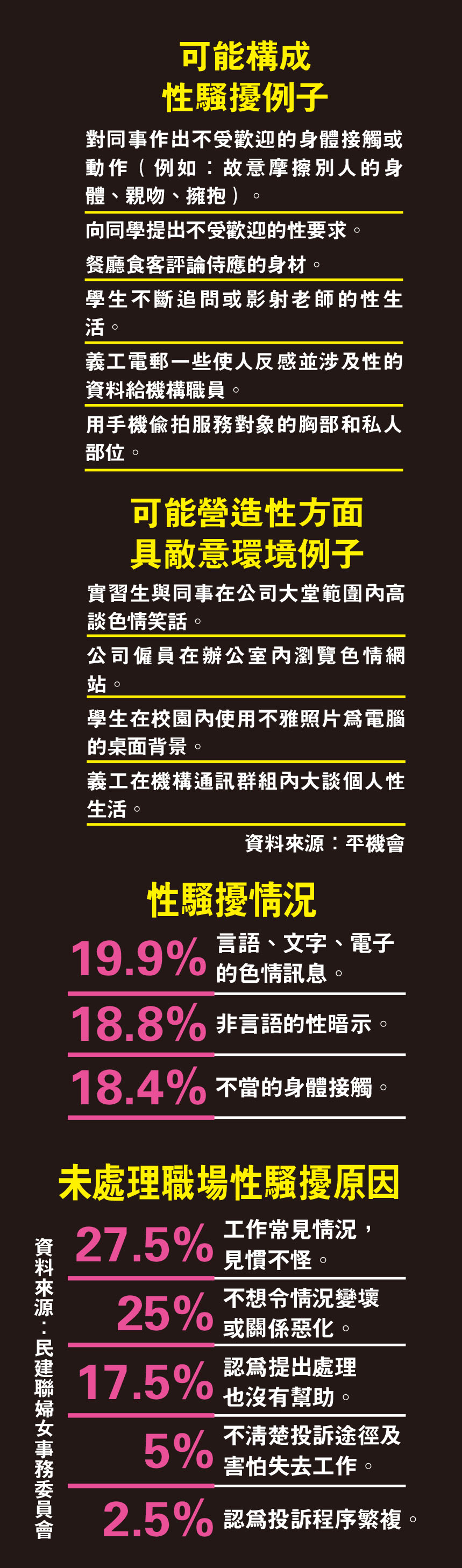 調查團隊上月11日至21日期間,訪問104名職場主管以及311名女性僱員,結果發現,逾九成企業表示沒有收到職場性騷擾的投訴,然而受訪女僱員當中,卻有超過三成受訪者表示曾遇到職場性騷擾,當中19.9%涉及言語/文字/電子訊息,18.4%則有身體接觸,而18.8%涉及性的非言語暗示。