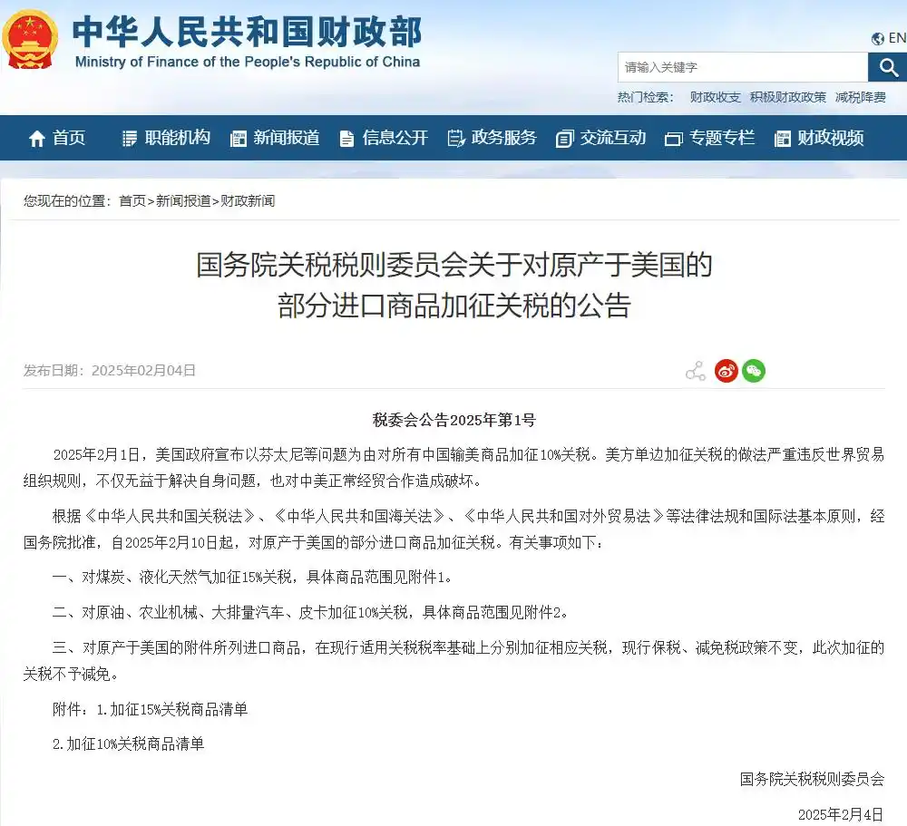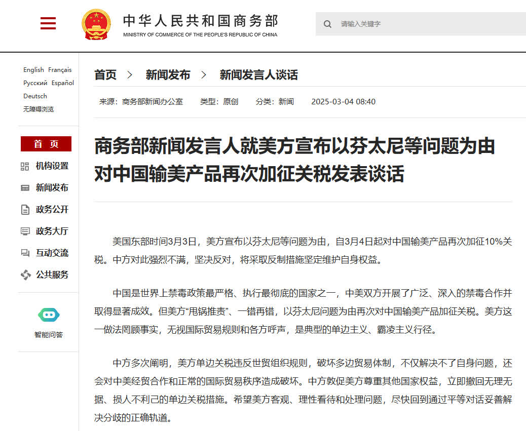 美國東部時間3月3日,美方宣布以芬太尼等問題為由,自3月4日起對中國輸美產品再次加徵10%關稅。中方對此強烈不滿,堅決反對。3月4日,中方接連表態並發布反制行動。