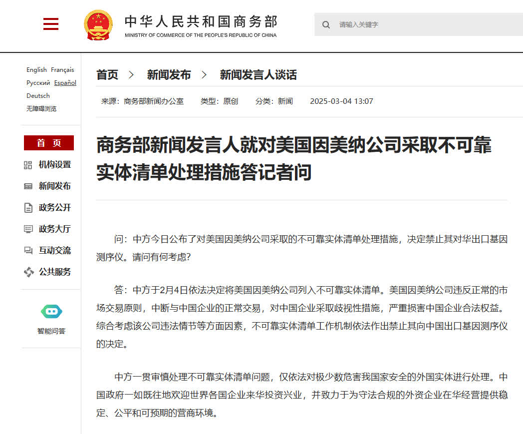 【商務部新聞發言人就對美國因美納公司採取不可靠實體清單處理措施答記者問】
