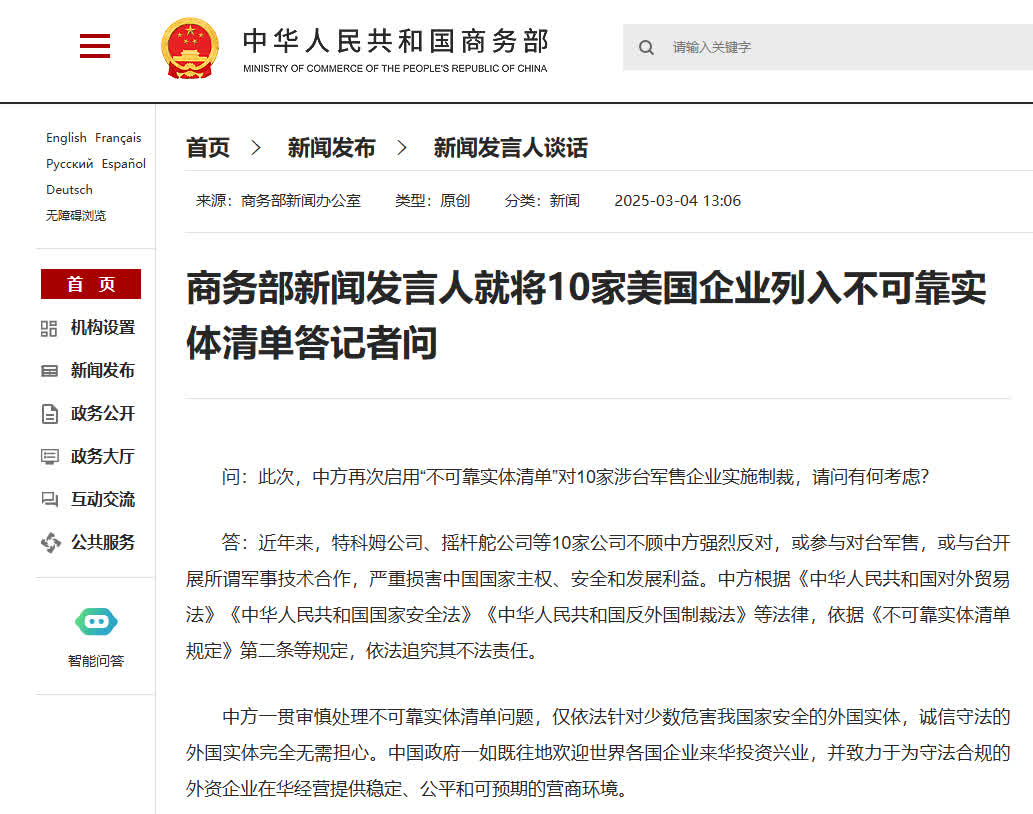 【商務部新聞發言人就將10家美國企業列入不可靠實體清單答記者問】