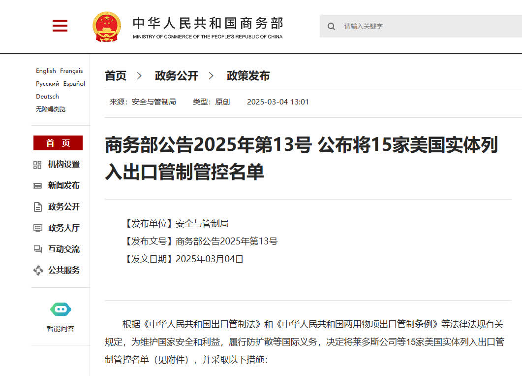 【商務部公告2025年第13號 公布將15家美國實體列入出口管制管控名單】