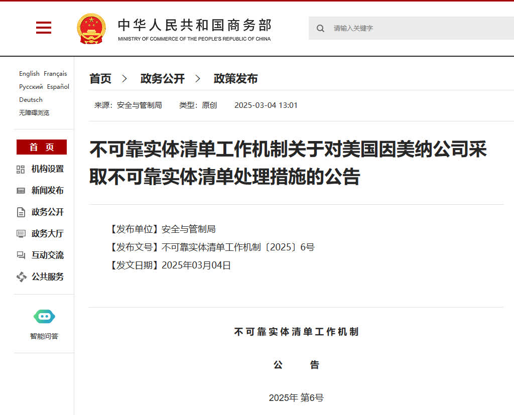 為維護國家主權、安全和發展利益,根據《中華人民共和國對外貿易法》《中華人民共和國國家安全法》《中華人民共和國反外國制裁法》等有關法律,依據《不可靠實體清單規定》有關規定,不可靠實體清單工作機制決定於2025年2月4日將美國因美納公司(Illumina, Inc.)列入不可靠實體清單。現決定對該企業採取以下處理措施: