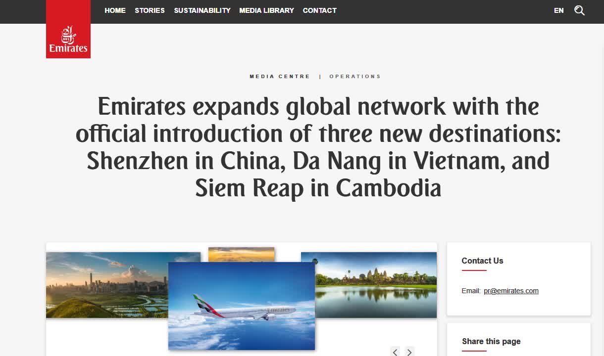 阿聯酋航空自2002年開通迪拜至上海航線以來,已在中國內地建立直航網絡,目前運營往返上海、北京和廣州的航班。該航空公司每周承運2000噸中國貨物,此次新增的深圳航線將進一步促進兩地貿易往來。