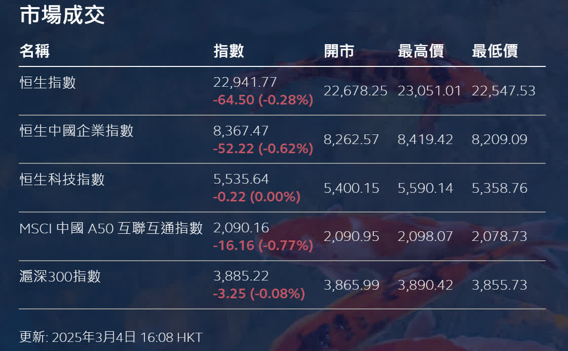 香港文匯報訊 美國對多國進口商品關稅落地,持續影響投資氣氛,港股今日(3月4日)維持放量震盪。恒指早市低開,曾低見22,547點,隨後跌幅明顯收窄,收報22,941點,跌64點或0.3%。國指跌0.6%。科指基本持平。大市成交額2,695.28億元。