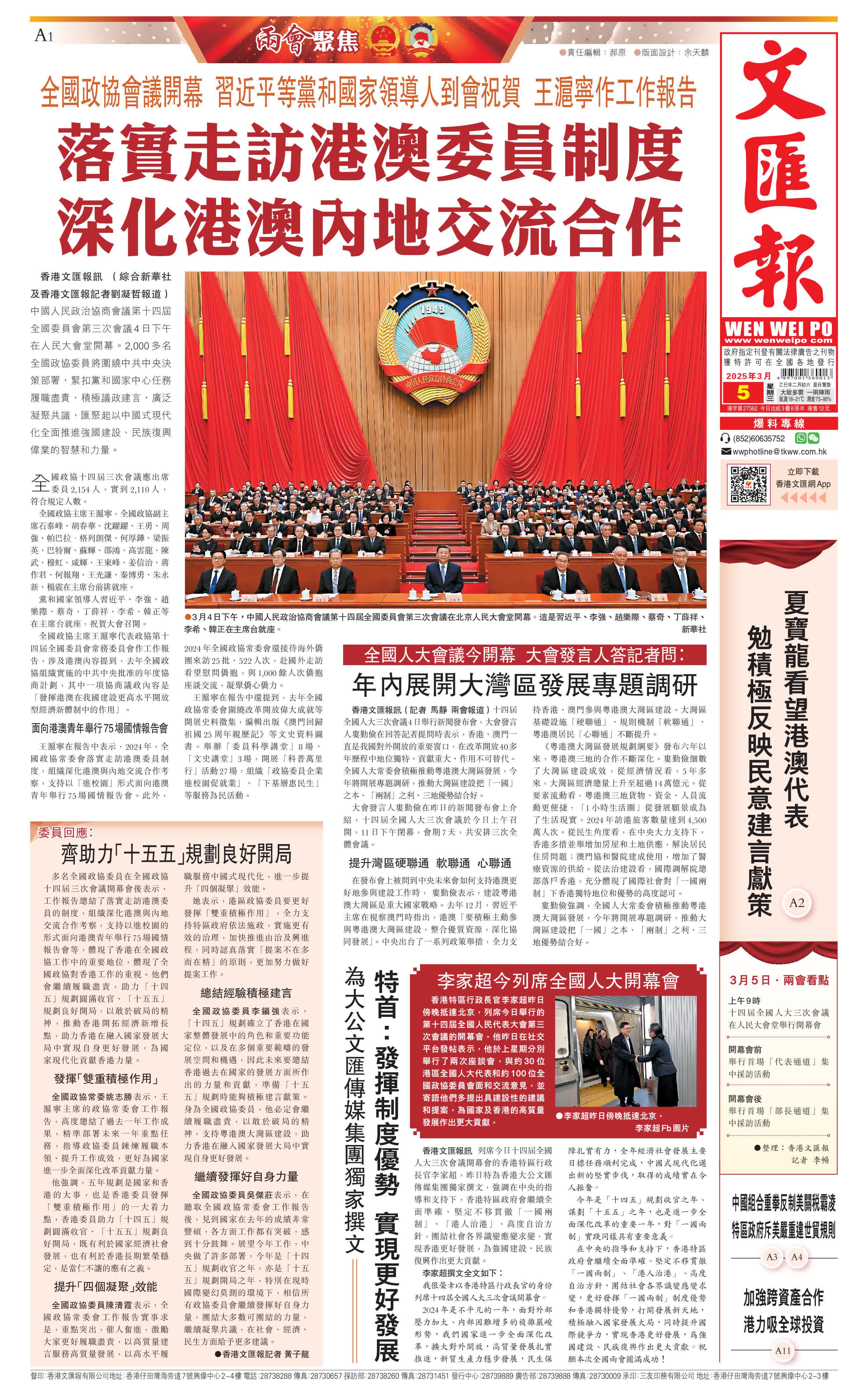 列席今日十四屆全國人大三次會議開幕會的香港特區行政長官李家超,昨日特為香港大公文匯傳媒集團獨家撰文,強調在中央的指導和支持下,香港特區政府會繼續全面準確、堅定不移貫徹「一國兩制」、「港人治港」、高度自治方針,團結社會各界識變應變求變,實現香港更好發展,為強國建設、民族復興作出更大貢獻。