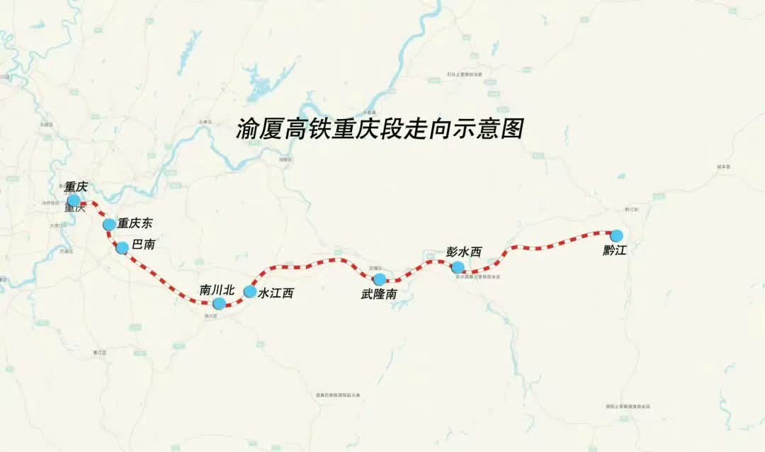 渝廈高鐵重慶段是國家中長期鐵路網規劃「八縱八橫」中渝廈通道的重要組成部分,從重慶站引出,途經渝中、南岸、巴南、南川、武隆、彭水等區縣,止於重慶市黔江區,設計時速350公里,是成渝城市群與長株潭城市群、海西經濟區之間的高速客運交流主通道。