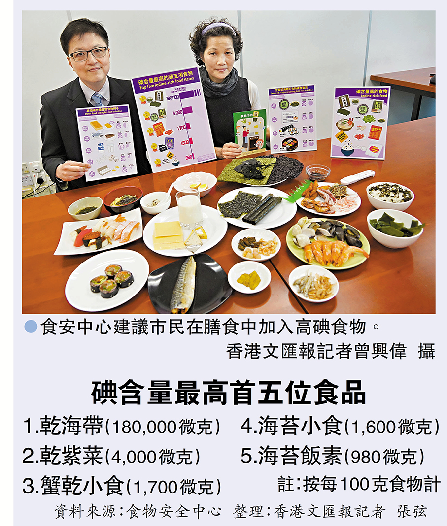 香港文匯報訊(記者 張弦)碘是人體必需的微量營養素,對維持正常的甲狀腺功能和促進人體生長發育十分重要。衞生署的調查顯示,香港15歲至84歲人口的整體碘攝取量不足,35歲或以上人口更出現輕度缺碘,食安中心建議市民在膳食中加入高碘食物,包括藻類、海鮮、蛋類及奶類等,而一碗200克的韓式紫菜湯麵及中式紫菜湯,碘含量已相當於世衞建議每人每日150毫克碘攝取量的97%及111%。