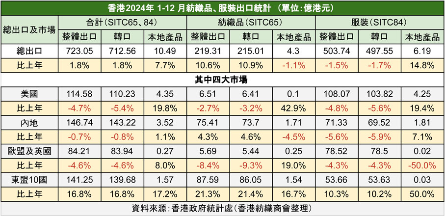 根據特區政府統計處最新公布的統計數據,2024年1至12月的香港的紡織品及服裝出口表現呈現出微幅增長,顯示出市場需求的多元化及某些區域市場的強勁表現。整體出口額達723.05億,比去年增長了1.8%。其中,轉口貿易佔據了大部分的出口,達712.56億(美元,下同),而本地產品的出口則為10.49億,較去年有所回升。