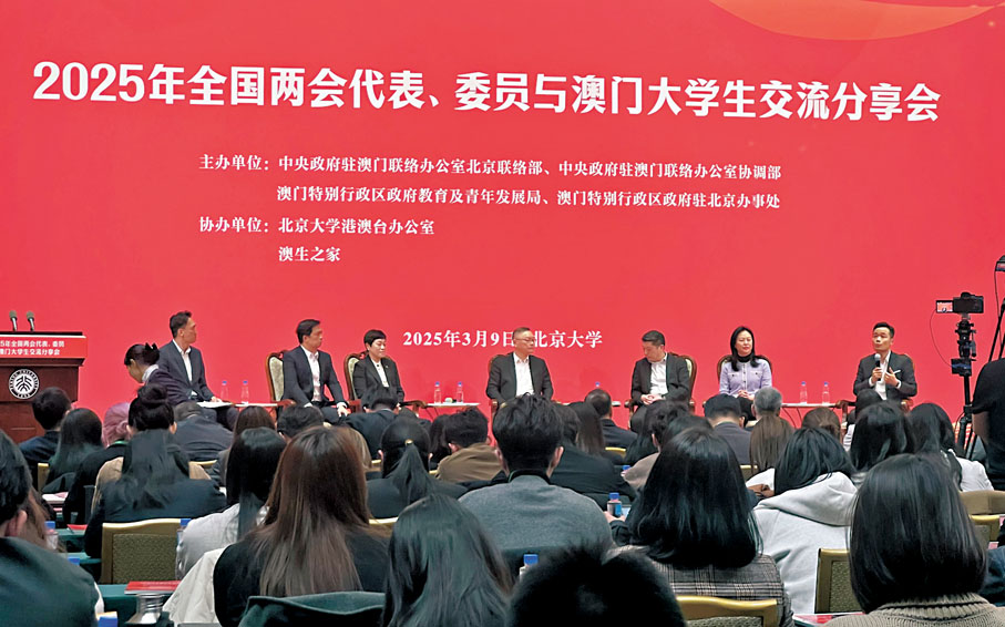 2025年全國兩會代表、委員與澳門大學生交流分享會9日晚間在北京大學舉行。中央政府駐澳門聯絡辦副主任張應傑、澳門特區政府社會文化司司長柯嵐、北京大學黨委書記何光彩出席並講話。澳區全國人大代表崔世平、何敬麟、陳虹以及澳區全國政協委員陳季敏、林倫偉、羅奕龍介紹今年兩會精神,並與來自北京、天津等地35所高校約200名澳門大學生進行交流。●香港文匯報記者 郭瀚林、實習記者 劉婷玉 兩會報道