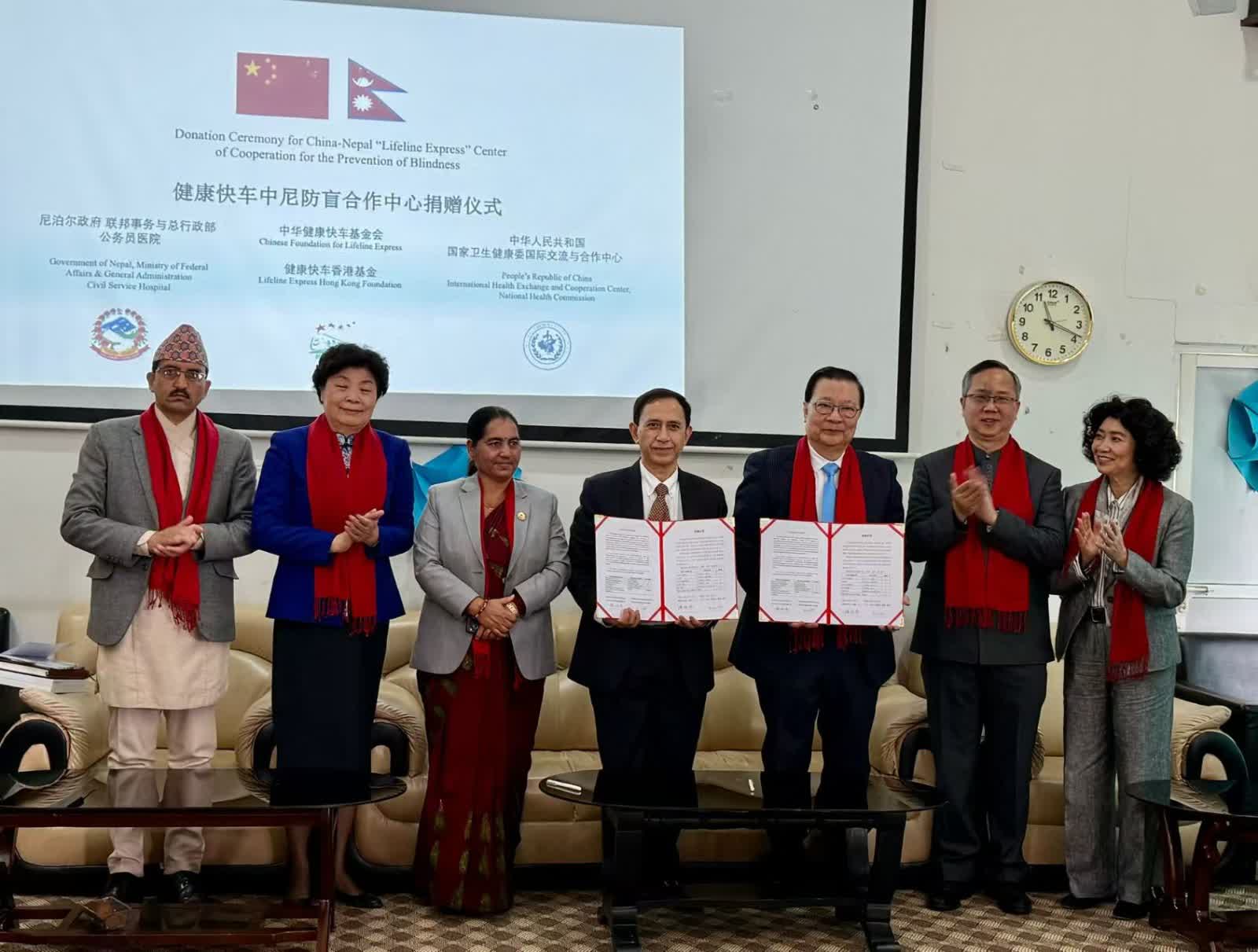 香港文匯報訊 中國慈善組織「健康快車」於3月7日在尼泊爾公務員醫院開設第三所海外防盲合作中心「健康快車中尼防盲合作中心」,並向公務員醫院捐贈了一批價值100萬元人民幣的眼科醫療設備,並簽署了合作備忘錄,「健康快車」香港基金主席譚耀宗等出席儀式。