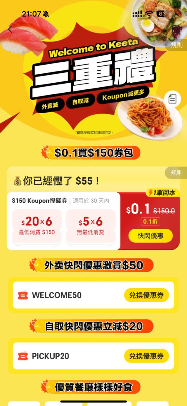香港文匯報訊(記者 周曉菁)戶戶送宣布撤出香港市場,美團(3690)旗下外賣平台 keeta 連夜加碼推出「狂送三重禮」,不論新舊用戶都可花費0.1元享高達150元的優惠券套裝,更可與商戶折扣、運費優惠同時使用。