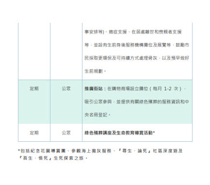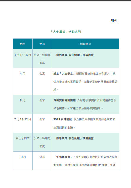 為推動綠色殯葬,食物環境衞生署(食環署)推出「人生學堂」活動系列,透過多元化的形式鼓勵市民考慮選擇綠色殯葬,及早規劃身後事。活動涵蓋多項創新項目,包括介紹晚年支援與身後安排資源的「生死博覽會」、透過認識社區特色景點反思生死的「尋生・論死」社區導賞團,以及透過實地考察深化生命教育的「吾生・悟死」青年計劃。此外,食環署亦將通過線上平台推出系列短片,詳細介紹綠色殯葬申請流程,並釐清常見誤解,幫助公眾更全面地了解相關資訊。
