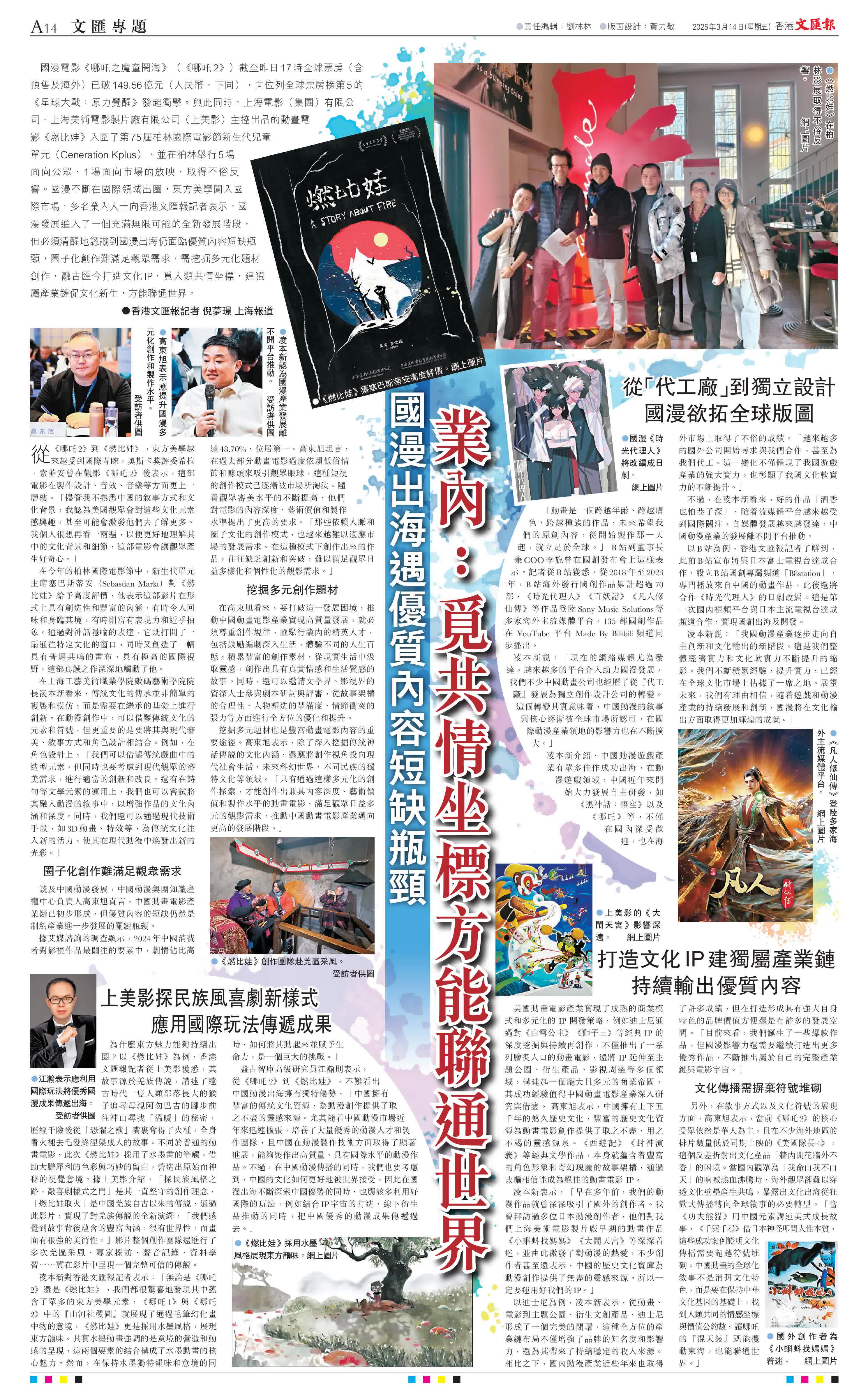 (香港文匯報記者 倪夢璟 上海報道)國漫電影《哪吒之魔童鬧海》(《哪吒2》)截至昨日17時全球票房(含預售及海外)已破149.56億元(人民幣,下同),向位列全球票房榜第5的《星球大戰:原力覺醒》發起衝擊。與此同時,上海電影(集團)有限公司、上海美術電影製片廠有限公司(上美影)主控出品的動畫電影《燃比娃》入圍了第75屆柏林國際電影節新生代兒童單元(Generation Kplus),並在柏林舉行5場面向公眾、1場面向市場的放映,取得不俗反響。國漫不斷在國際領域出圈,東方美學闖入國際市場,多名業內人士向香港文匯報記者表示,國漫發展進入了一個充滿無限可能的全新發展階段,但必須清醒地認識到國漫出海仍面臨優質內容短缺瓶頸,圈子化創作難滿足觀眾需求,需挖掘多元化題材創作,融古匯今打造文化IP,覓人類共情坐標,建獨屬產業鏈促文化新生,方能聯通世界。