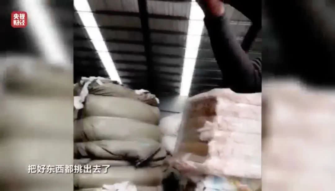 為了展示自己的實力,劉總帶着記者走進了公司的大院,院子左側倉庫的大門敞開,門口貼着「外來人員禁止入內禁止拍照」的提示,倉庫中堆放着貨物。劉總介紹,這些貨正是他成噸採購回來的紙尿褲、衞生巾的生產垃圾。