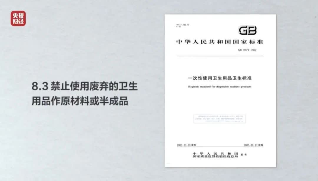 按照國標GB 15979-2002《一次性使用衞生用品衞生標準》的明文規定,禁止使用廢棄的衞生用品作原材料或半成品。而且衞生巾、紙尿褲等產品在原材料衞生、生產環境與過程衞生、消毒過程、包裝運輸與貯存等方面,國家質量法規都有着嚴格的要求。