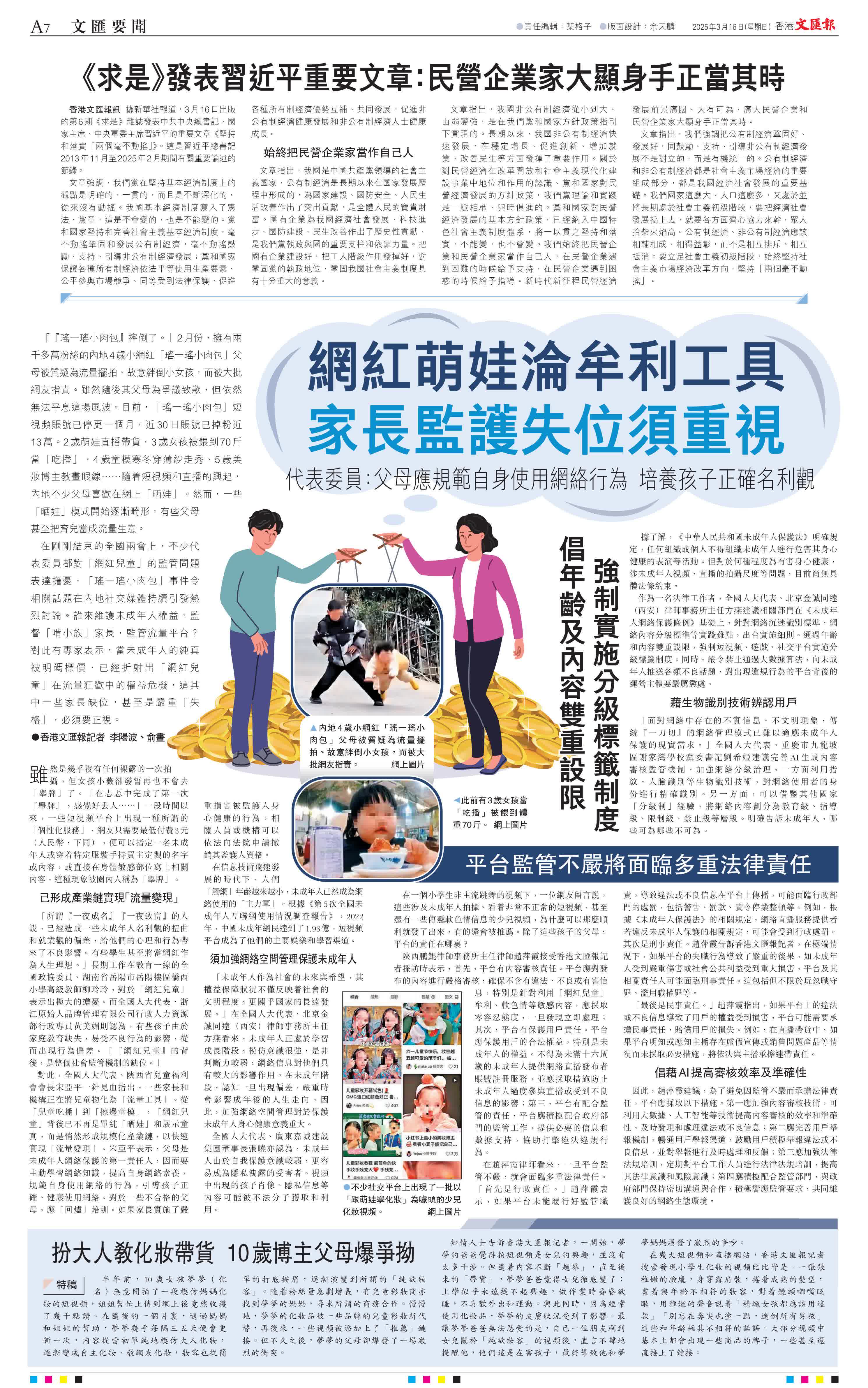 (香港文匯報記者 李陽波、俞晝)「『瑤一瑤小肉包』摔倒了。」2月份,擁有兩千多萬粉絲的內地4歲小網紅「瑤一瑤小肉包」父母被質疑為流量擺拍、故意絆倒小女孩,而被大批網友指責。雖然隨後其父母為爭議致歉,但依然無法平息這場風波。目前,「瑤一瑤小肉包」短視頻賬號已停更一個月,近30日賬號已掉粉近13萬。2歲萌娃直播帶貨,3歲女孩被餵到70斤當「吃播」、4歲童模寒冬穿薄紗走秀、5歲美妝博主教畫眼線……隨着短視頻和直播的興起,內地不少父母喜歡在網上「晒娃」。然而,一些「晒娃」模式開始逐漸畸形,有些父母甚至把育兒當成流量生意。