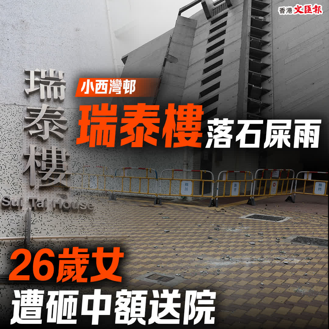 香港文匯報訊(記者 蕭景源)今晨(16日)約7時04分,小西灣邨瑞泰樓36樓外牆突有大片紙皮石剝落,碎片頓如雨下,飛墮對開路面,一名女途人走避不及被擊中額頭受傷,其後由救援人員包紮,清醒送往東區醫院治理。