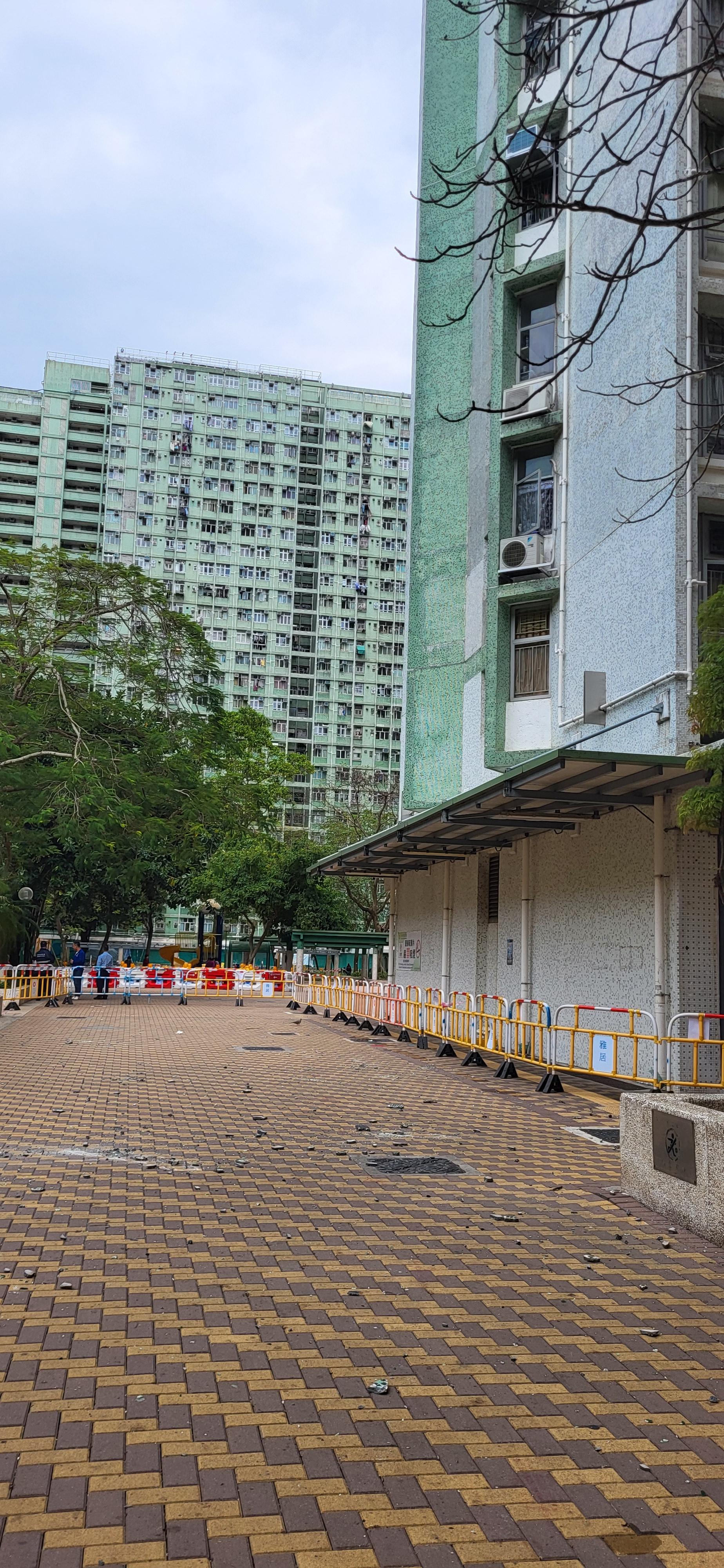 事發後,警員圍封現場調查,防止途人接近。現場可見,大量石屎碎片落落地面,物業管理公司人員亦到場了解。至於剝落的外牆紙皮石面積約1米乘1米,警方將案列作「高空墮物–有人受傷」交由東區警區刑事調查隊第三隊跟進,暫未有人被捕。