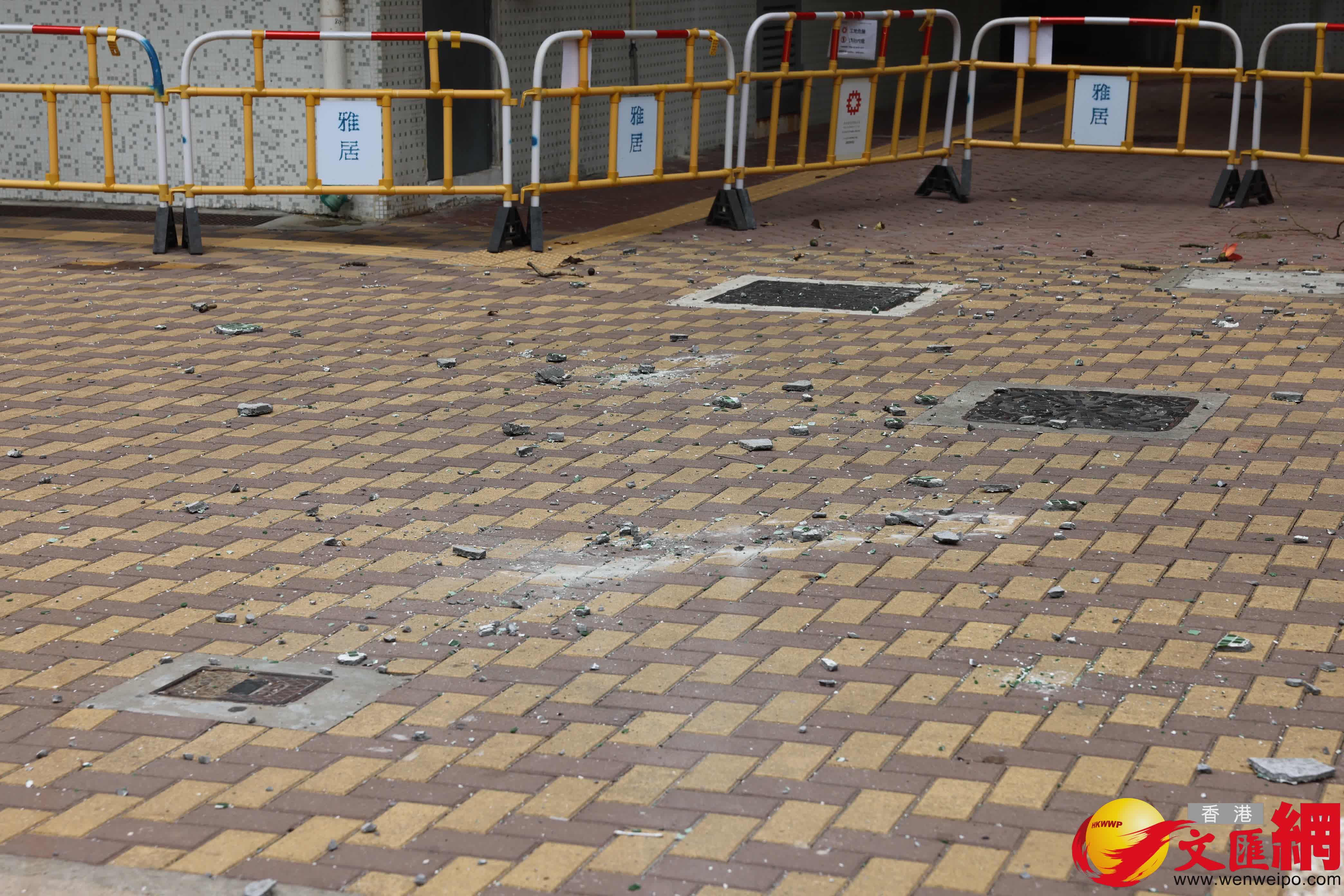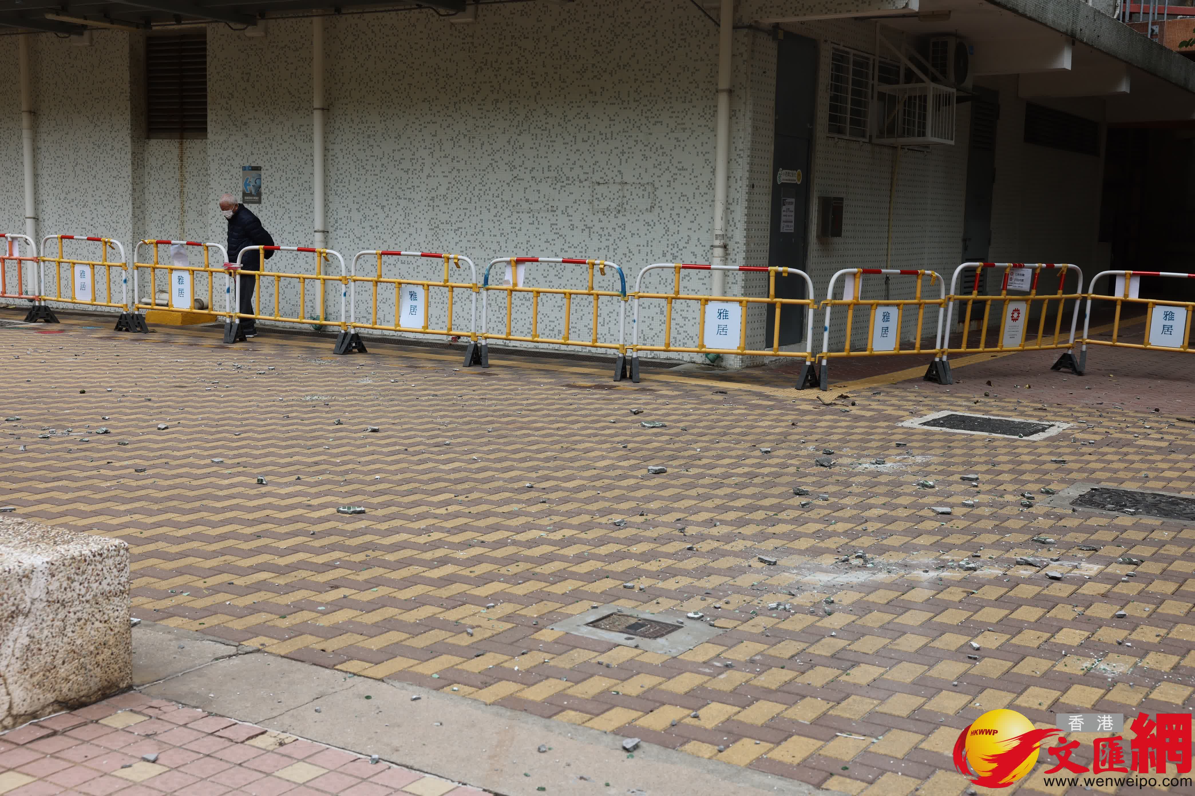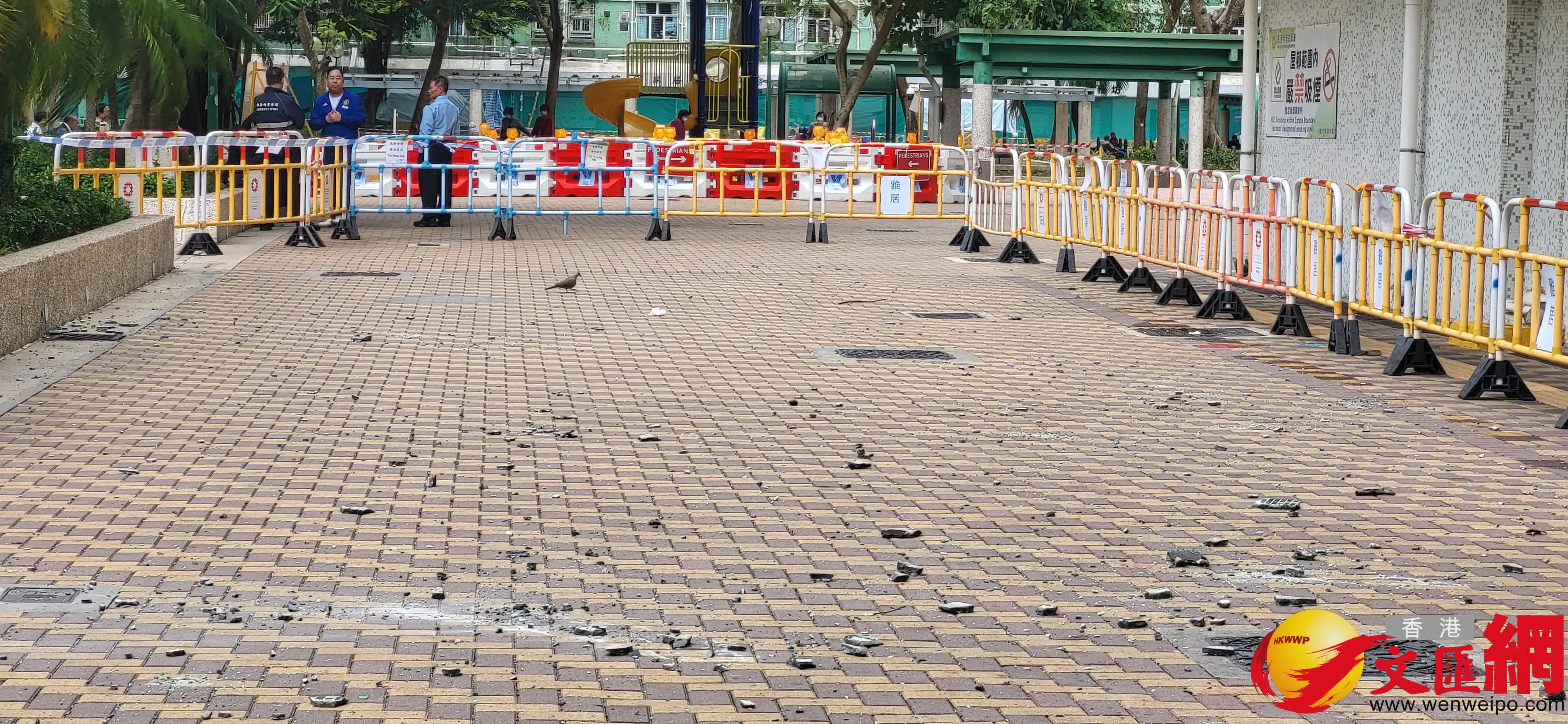 大量石屎碎散落地面,現場已被圍封防止途人接近。香港文匯報記者鄧偉明攝受傷女途人姓董(26歲),送院經檢查後,證實額頭擦傷紅腫及感到暈眩,傷勢不算嚴重。