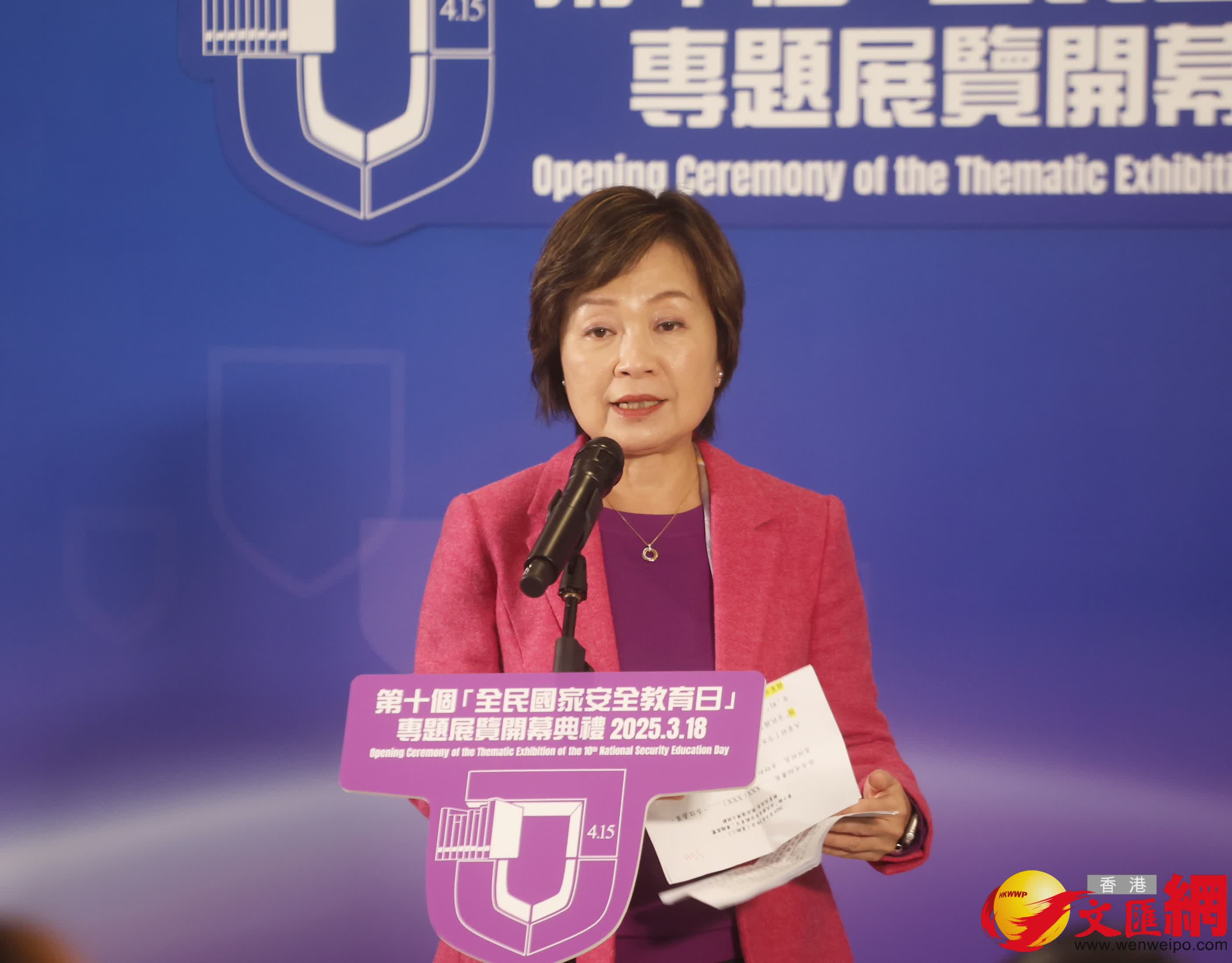 蔡若蓮指,是次專題展覽主題是「全民國家安全教育 走深走實十周年」,展現了國家在國家安全方面的推廣與實踐,並回顧香港特區過去推動全民國家安全教育的成果。是次專題展覽自明天起正式開放給市民進行參觀。