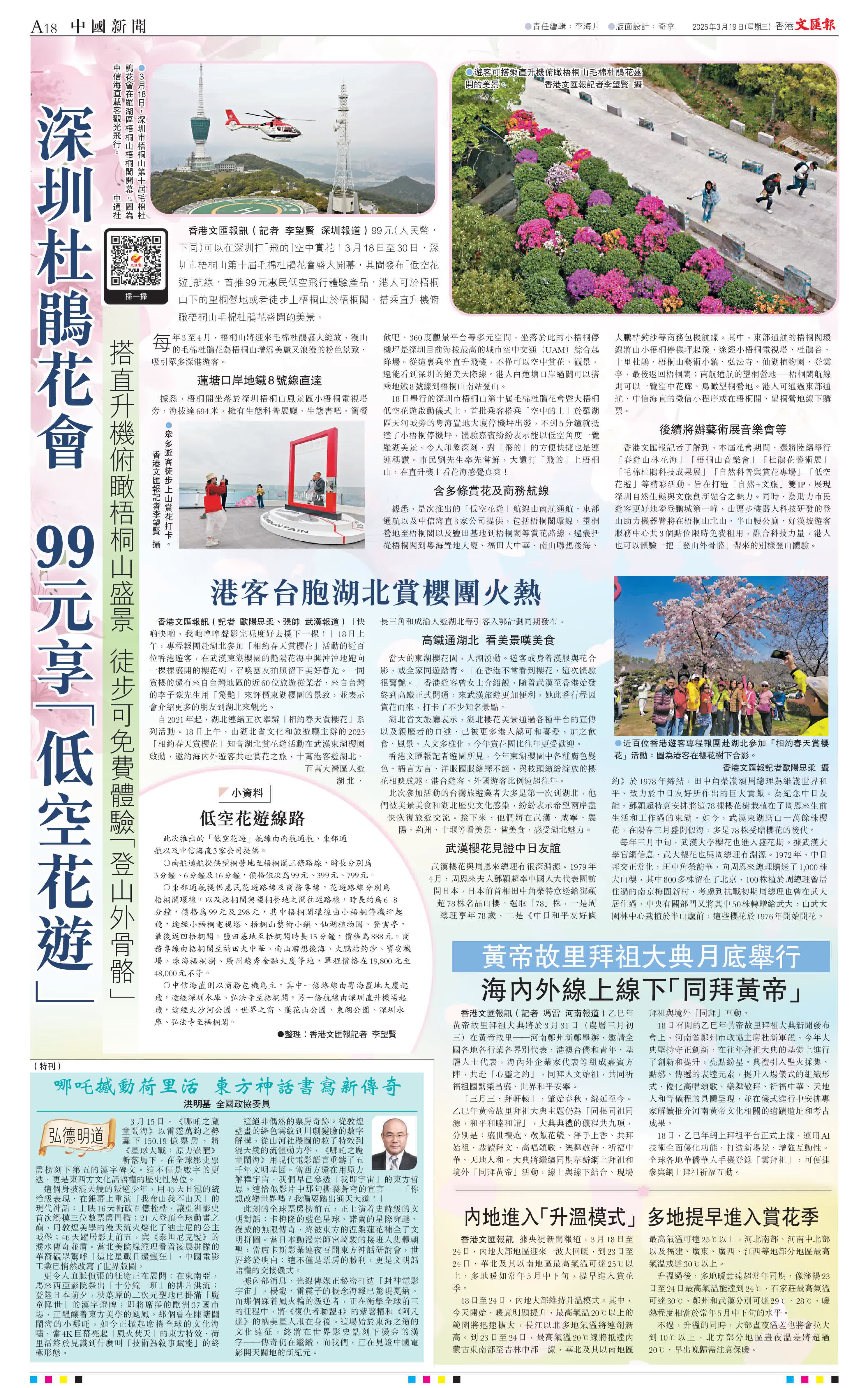 (香港文匯報記者 李望賢 深圳報道)99元(人民幣,下同)可以在深圳打「飛的」空中賞花!3月18日至30日,深圳市梧桐山第十屆毛棉杜鵑花會盛大開幕,其間發布「低空花遊」航線,首推99元惠民低空飛行體驗產品,港人可於梧桐山下的望桐營地或者徒步上梧桐山於梧桐閣,搭乘直升機俯瞰梧桐山毛棉杜鵑花盛開的美景。