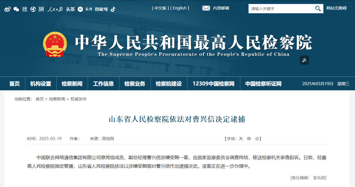 據最高人民檢察院消息,中國聯合網絡通信集團有限公司原黨組成員、副總經理曹興信涉嫌受賄一案,由國家監察委員會調查終結,移送檢察機關審查起訴。日前,經最高人民檢察院指定管轄,山東省人民檢察院依法以涉嫌受賄罪對曹興信作出逮捕決定。該案正在進一步辦理中。