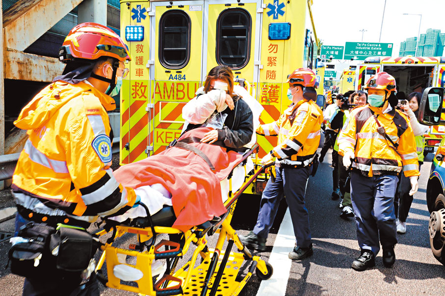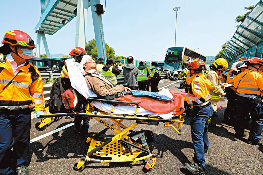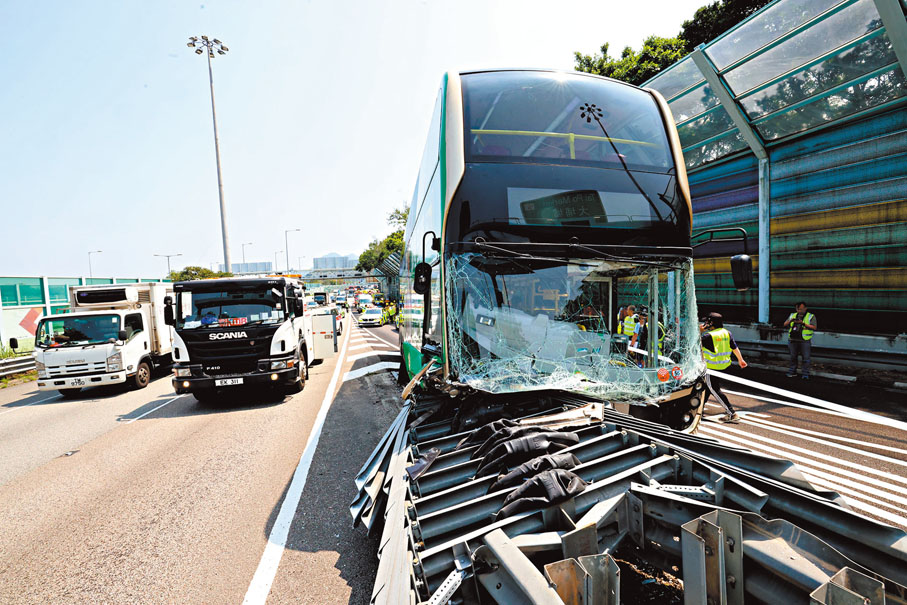 香港文匯報訊(記者 蕭景源)一輛雙層九巴昨日沿吐露港公路行駛途中,在大埔分岔路口直撼路中風琴式防撞欄,巴士車頭嚴重損毀,部分乘客變「滾地葫蘆」及撞擊椅背,意外造成巴士司機和10名乘客浴血受傷,救護員將傷者分批送院救治,其中1人送院後情況危殆。由於風琴式防撞欄能夠吸收車輛撞擊能量,從而減低意外對司機和乘客可能造成的損傷,故今次意外中雖撞擊猛烈,但未有造成嚴重傷亡,警方新界北總區交通意外調查隊正循不同方向調查意外成因。