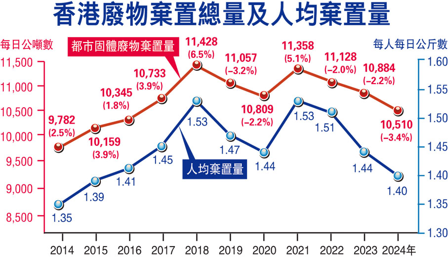 環境及生態局昨日在社交平台發帖表示,都市固體廢物由2023年約397萬公噸,減至去年約385萬公噸,即減少了約12.6萬公噸。不過,環保署在25/26年度財政預算案總目開支分析中,顯示去年堆填區接收的廢物量只較2023年減少了約3.8萬公噸,這是因為堆填區接收的廢物包括都市固體廢物、建築廢物和特殊廢物,而去年建築廢物的棄置量有所上升,導致整體廢物棄置量減幅不及都市固體廢物棄置量的減幅。