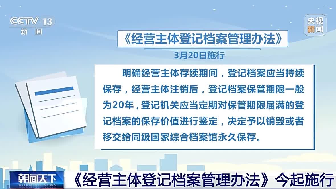 日前,市場監管總局和國家檔案局聯合制定出台《經營主體登記檔案管理辦法》,加強經營主體登記檔案的規範化管理,有效保護和利用登記檔案。《辦法》從今天(20日)起正式施行。