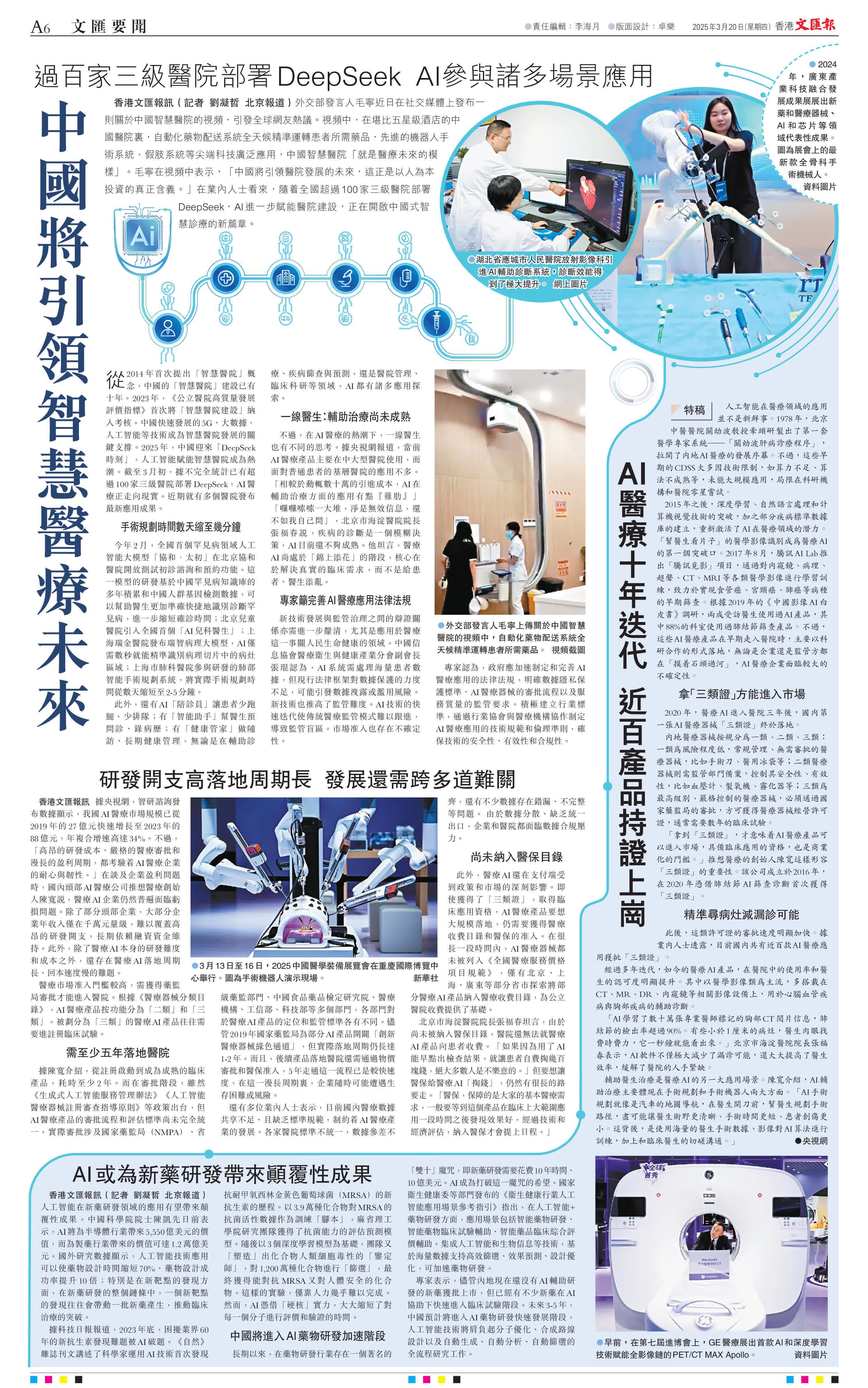 從2014年首次提出「智慧醫院」概念,中國的「智慧醫院」建設已有十年。2023年,《公立醫院高質量發展評價指標》首次將「智慧醫院建設」納入考核。中國快速發展的5G、大數據、人工智能等技術成為智慧醫院發展的關鍵支撐。2025年,中國迎來「DeepSeek時刻」,人工智能賦能智慧醫院成為熱潮。截至3月初,據不完全統計已有超過100家三級醫院部署DeepSeek,AI醫療正走向現實。近期就有多個醫院發布最新應用成果。