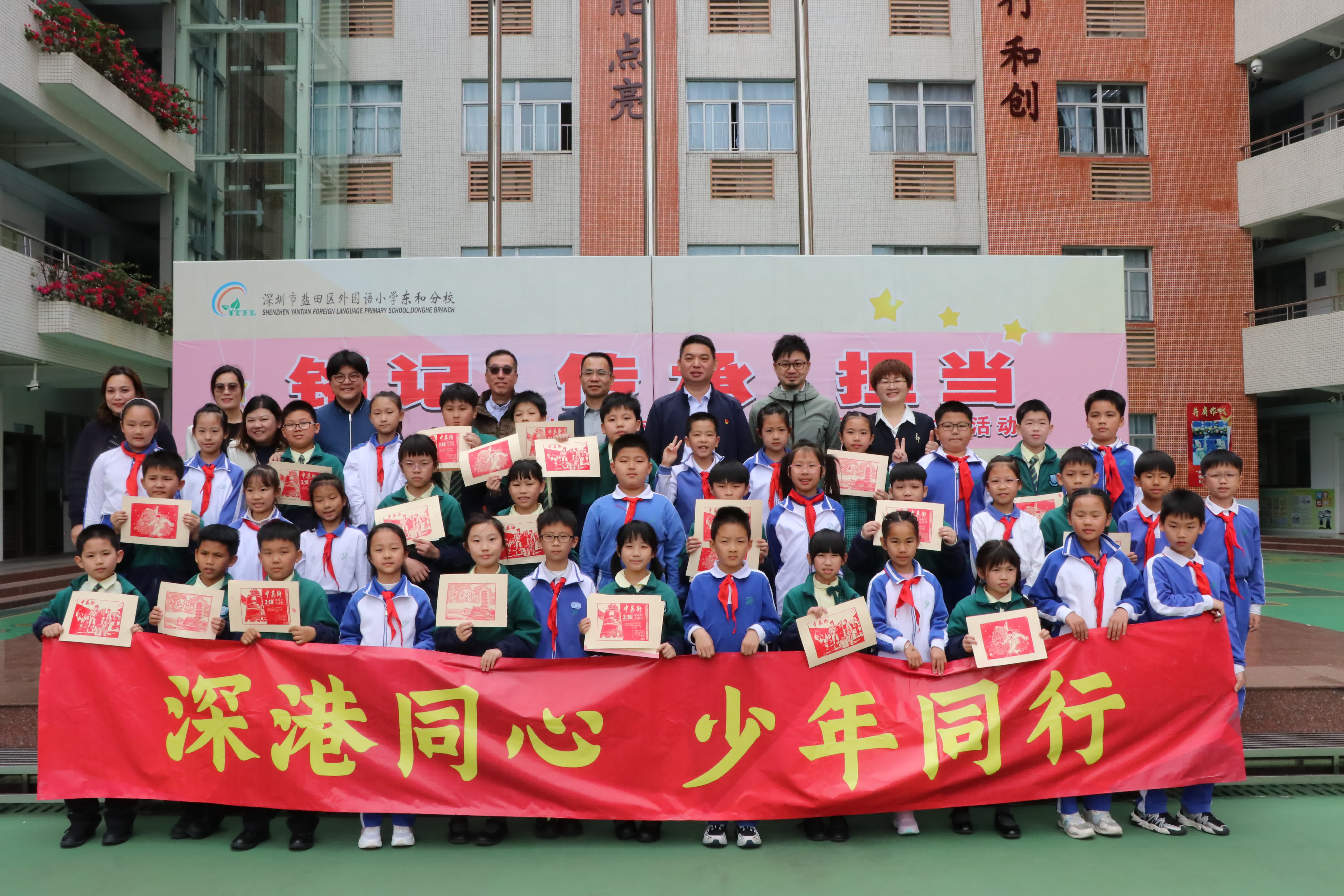 此外,兩地學生還體驗了東和分校的美術特色項目—印製版畫。版畫社團的同學們耐心地教香港同學如何滾墨、鋪紙、拓印,每一步都充滿了挑戰與樂趣。當滾輪在雕板上碾出均勻的墨痕,孩子們發出了陣陣驚嘆。當一幅幅展現中英街獨特場景的古塔、界碑等版畫躍然紙上時,孩子們更是欣喜不已。東和分校的學生將印製好的版畫贈送給香港的小夥伴,寓意着兩地情誼歷久彌新。香港沙頭角中心小學的同學們捧着自己印製的版畫表示:「這是我第一次體驗印製版畫,東和的同學非常耐心地教我們,我非常喜歡這樣的活動。」