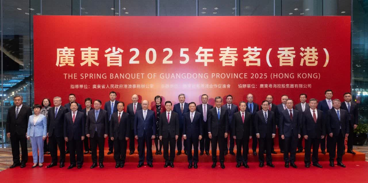 3月20日,廣東省2025年春茗(香港)活動在香港會展中心舉辦。全國政協副主席梁振英出席,香港特區行政長官李家超、中央政府駐港聯絡辦主任鄭雁雄出席並致辭,廣東省省長王偉中代表廣東省委省政府出席並致辭。
