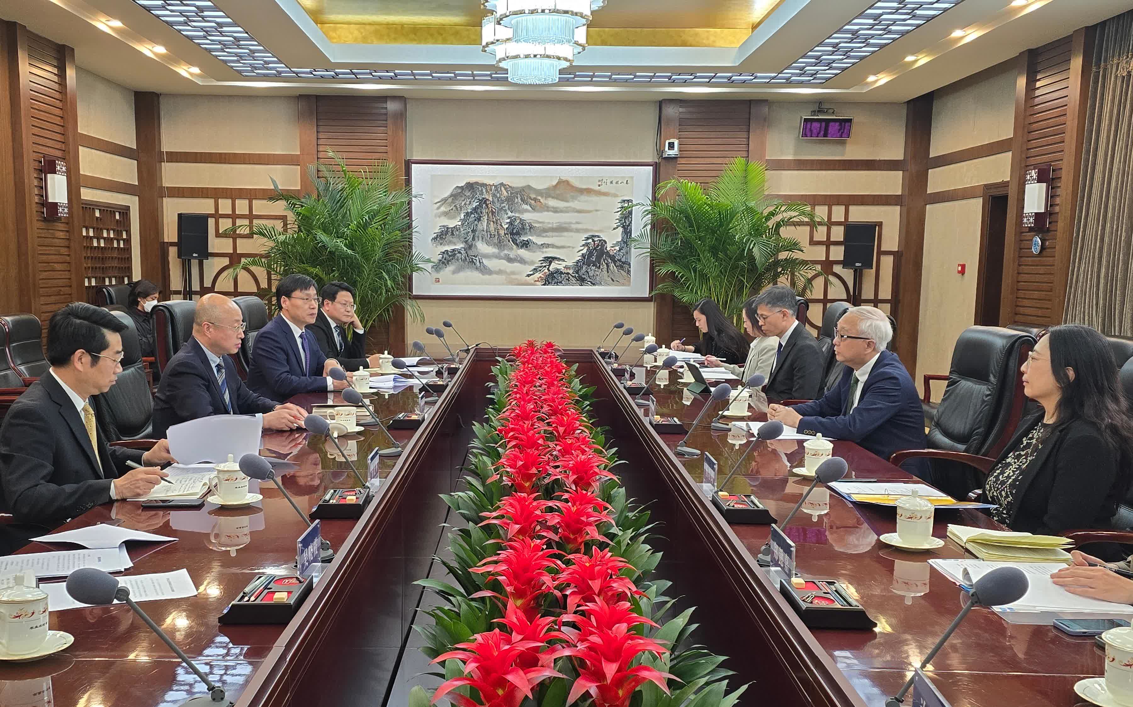 謝展寰下午拜訪國家農業農村部,與國家農業農村部副部長張興旺會面,介紹特區政府《漁農業可持續發展藍圖》下的各項措施,促進漁農業界的現代化和集約化,逐步邁向升級轉型,為香港市民提供更多新鮮、優質和安全的本地漁農產品,並強化香港的糧食安全。
