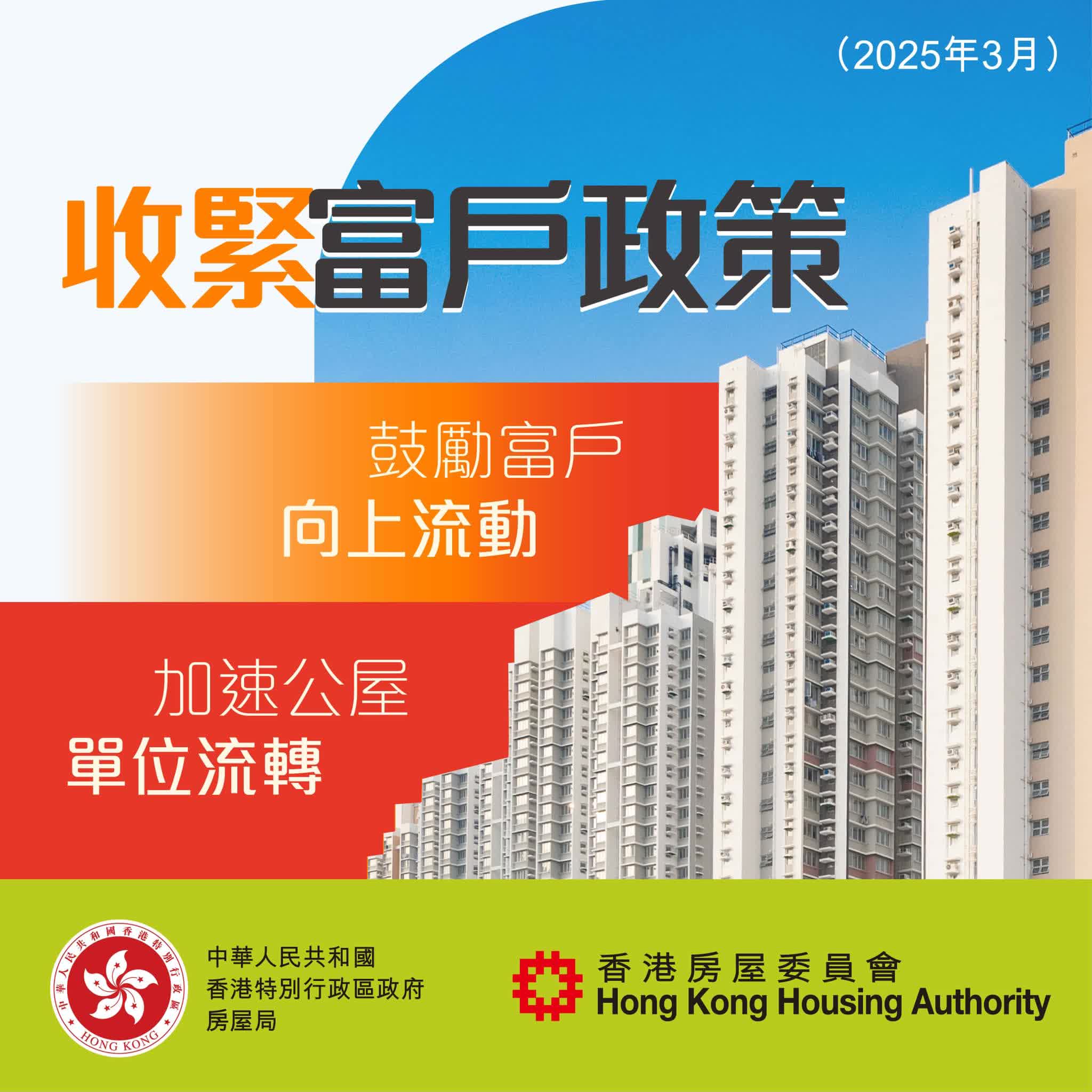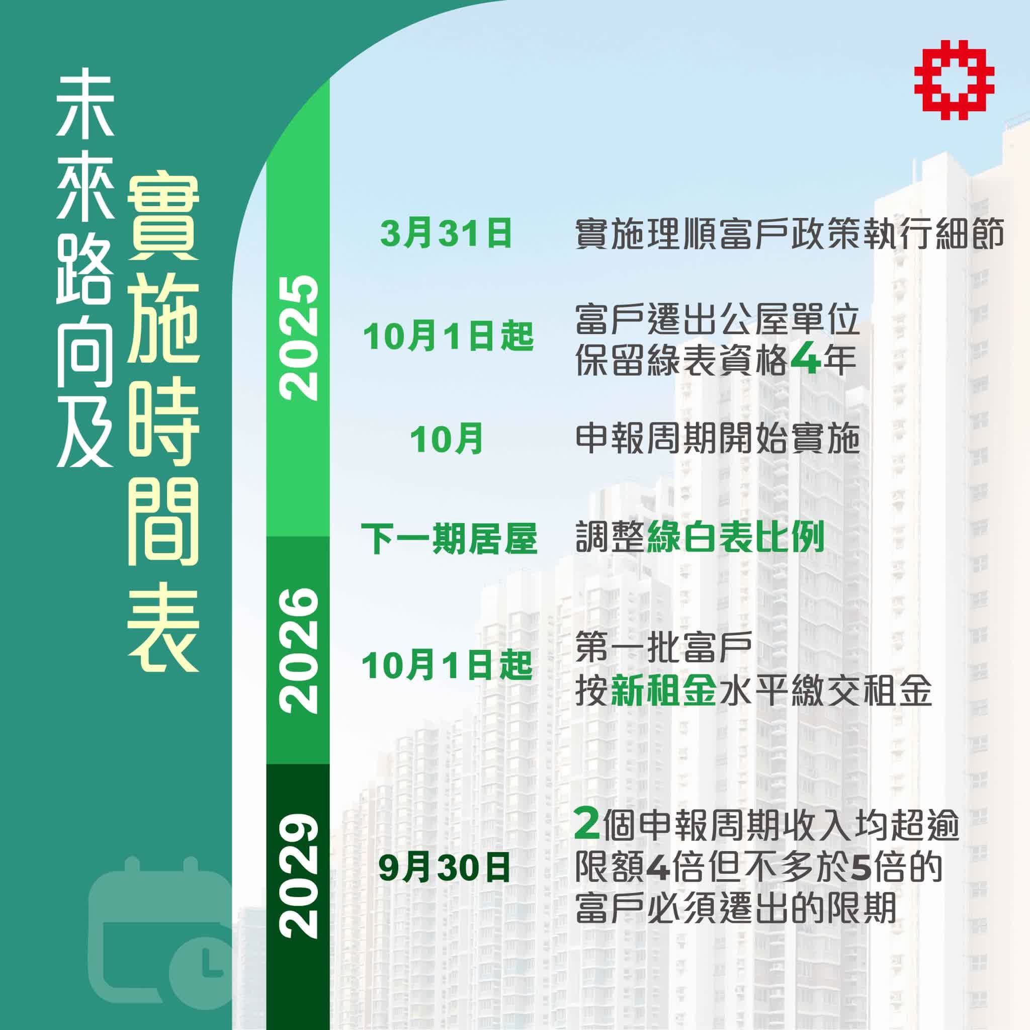 何永賢於社交平台發文指,政府推出三招組合拳,包括在下一期居屋將綠表和白表比例,由40比60改為50比50;讓繳交額外租金的公屋富戶,在遷出後保留4年的「綠表資格」;研究在資助出售單位銷售計劃推出新安排,協助富戶置業。