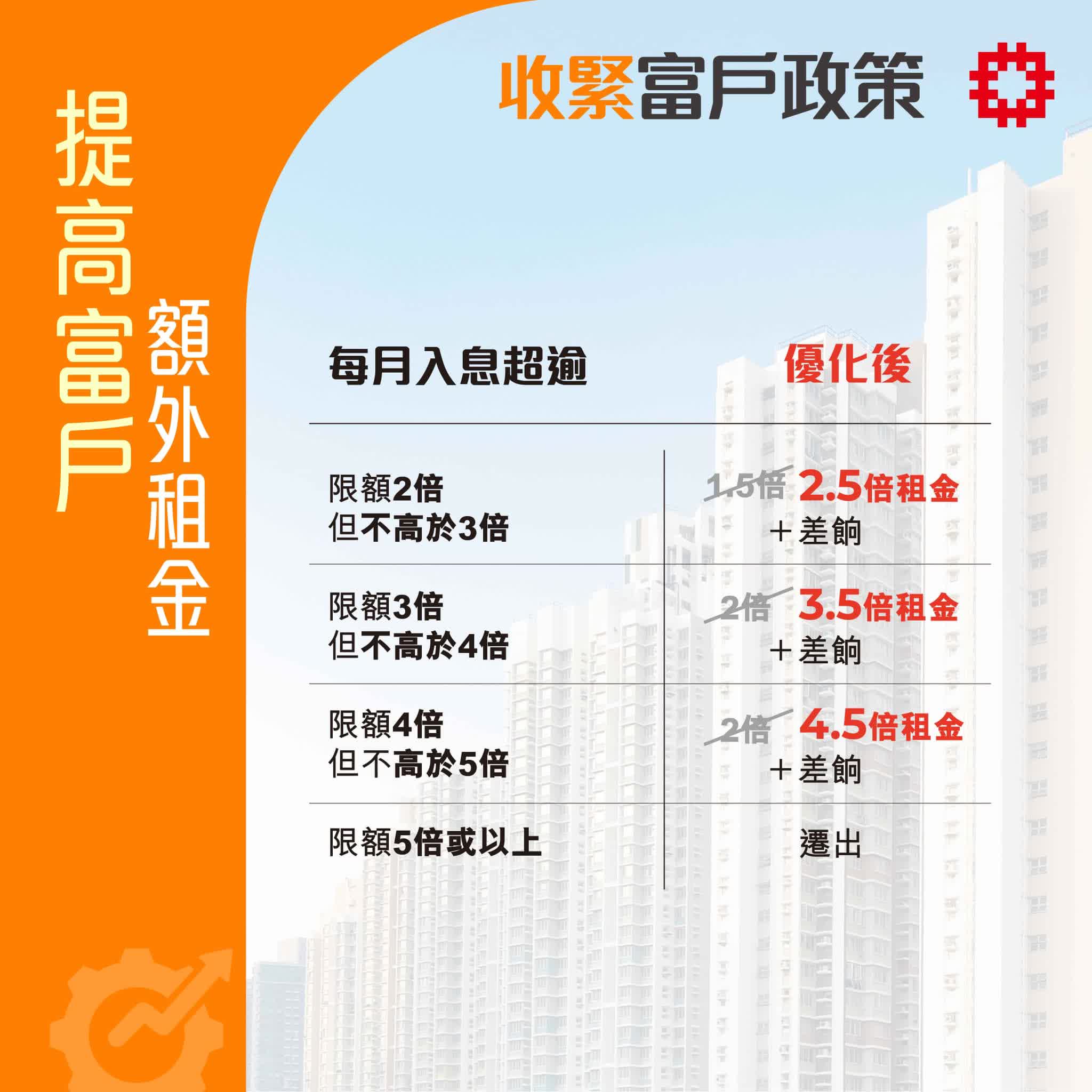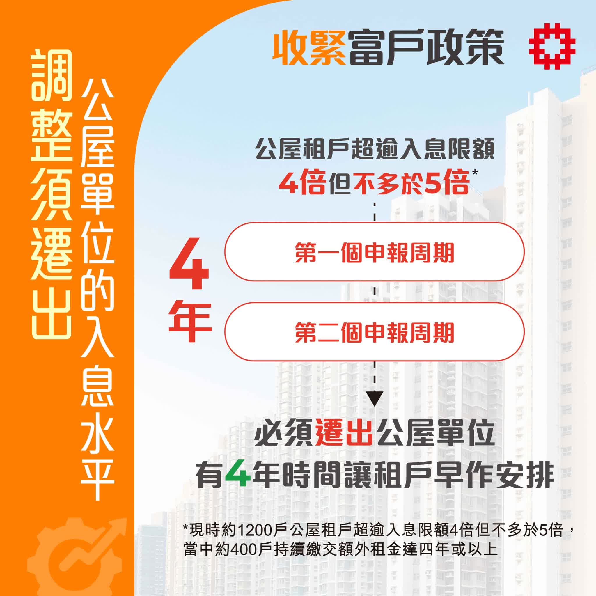 (大公文匯全媒體報道)房委會今日(21日)通過收緊公屋富戶政策,每月入息超過限額2倍至不高於5倍的富戶,額外租金由1.5倍至2倍,上調至2.5倍至4.5倍。此外,若富戶在兩個申報周期即合共4年,每月入息均處於4倍至5倍之間,會被要求遷出公屋。房屋局局長何永賢認為,新措施可以讓有能力的富戶及時騰出公屋單位,同時也有4年時間讓他們做好向上流動的準備。